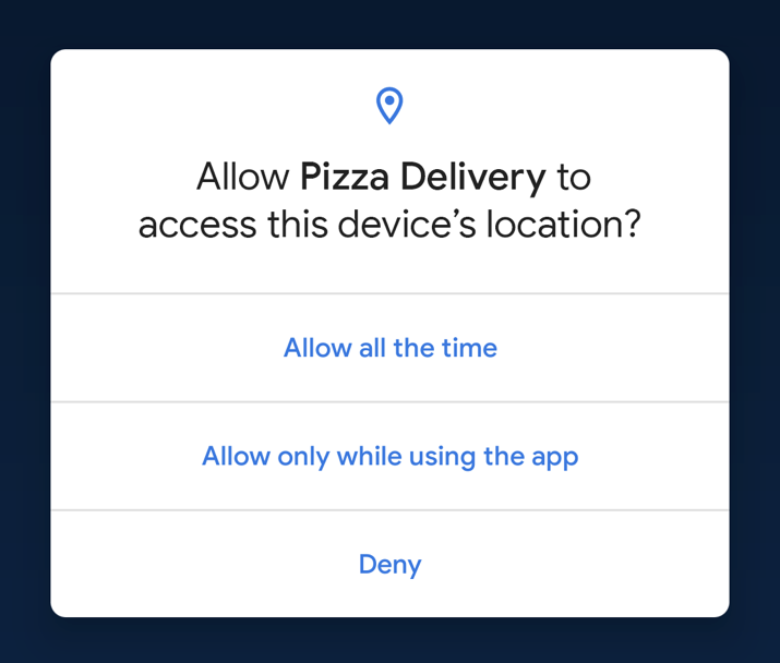 دادن کنترل بیشتر به کاربران بر دادههای موقعیت مکانی - کاربران از طریق یک گزینه مجوز جدید، کنترل بیشتری بر دادههای موقعیت مکانی خود دارند -- آنها اکنون میتوانند به یک برنامه اجازه دهند فقط در حالی که برنامه در حال استفاده است (در حال اجرا در پیشزمینه) به موقعیت مکانی دسترسی داشته باشد. برای اکثر برنامهها، این سطح دسترسی کافی را فراهم میکند، در حالی که برای کاربران، پیشرفت بزرگی در شفافیت و کنترل است. برای کسب اطلاعات بیشتر در مورد تغییرات موقعیت مکانی، به راهنمای توسعهدهنده یا پست وبلاگ ما مراجعه کنید.