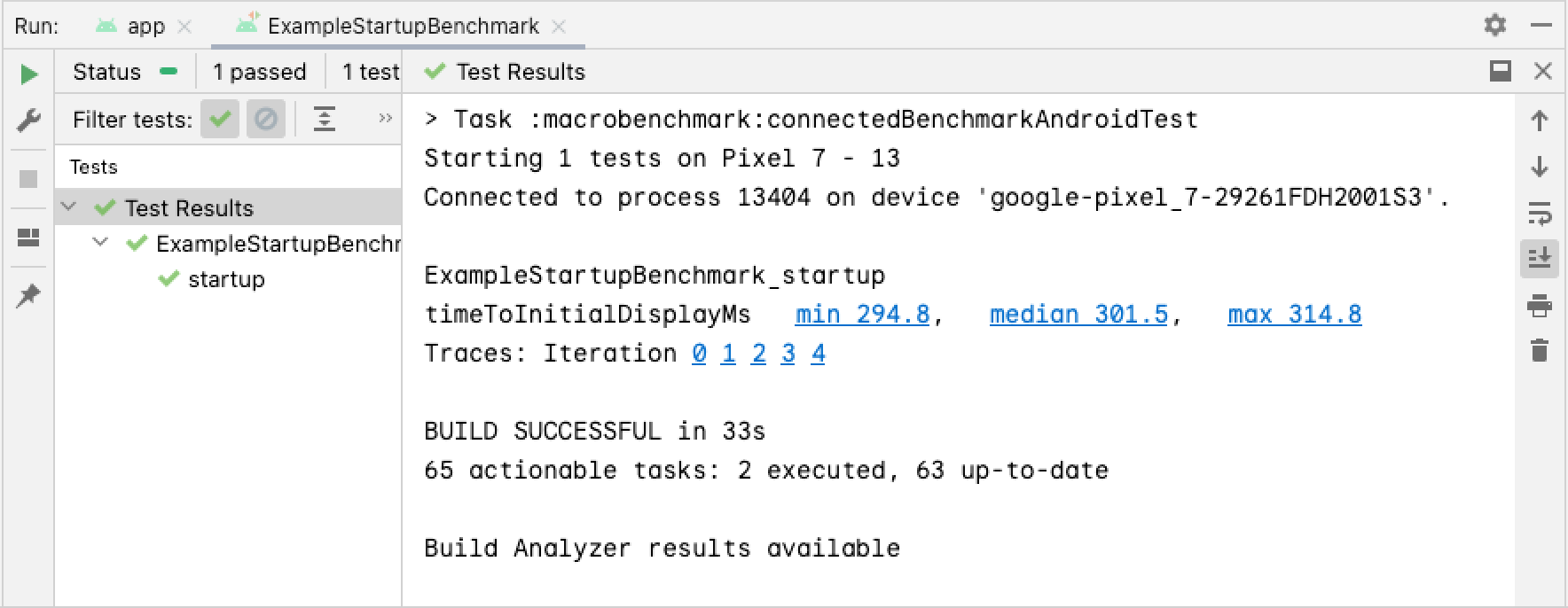 Una vez que ejecutes las comparativas, se volverá a compilar tu app y se ejecutarán las comparativas. Estas se iniciarán, se detendrán e incluso reinstalarán la app varias veces según las iterations que hayas definido.
