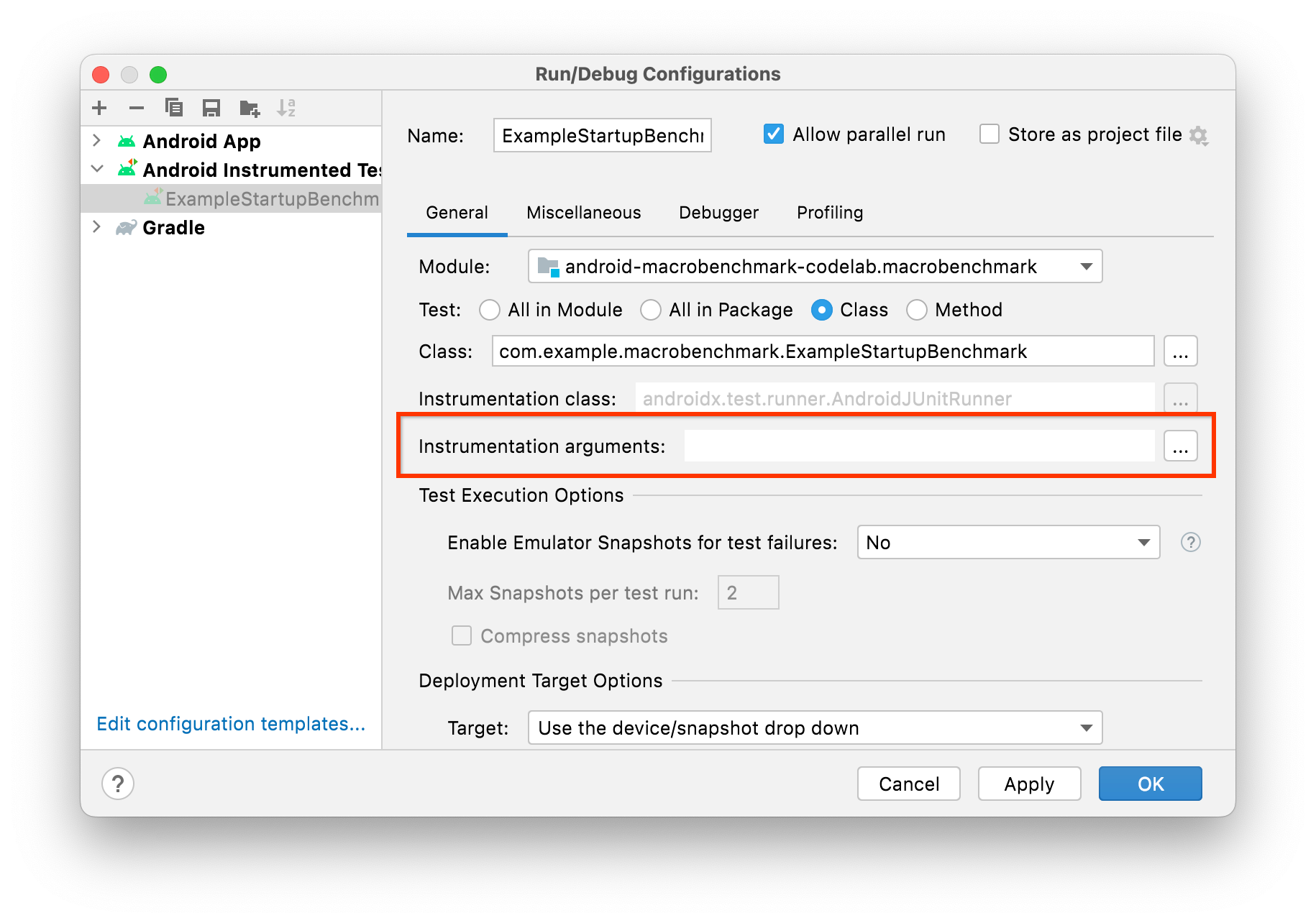 . - Haz clic en Aceptar para confirmar la elección. Deberías ver el argumento en la fila de "Instrumentation arguments"