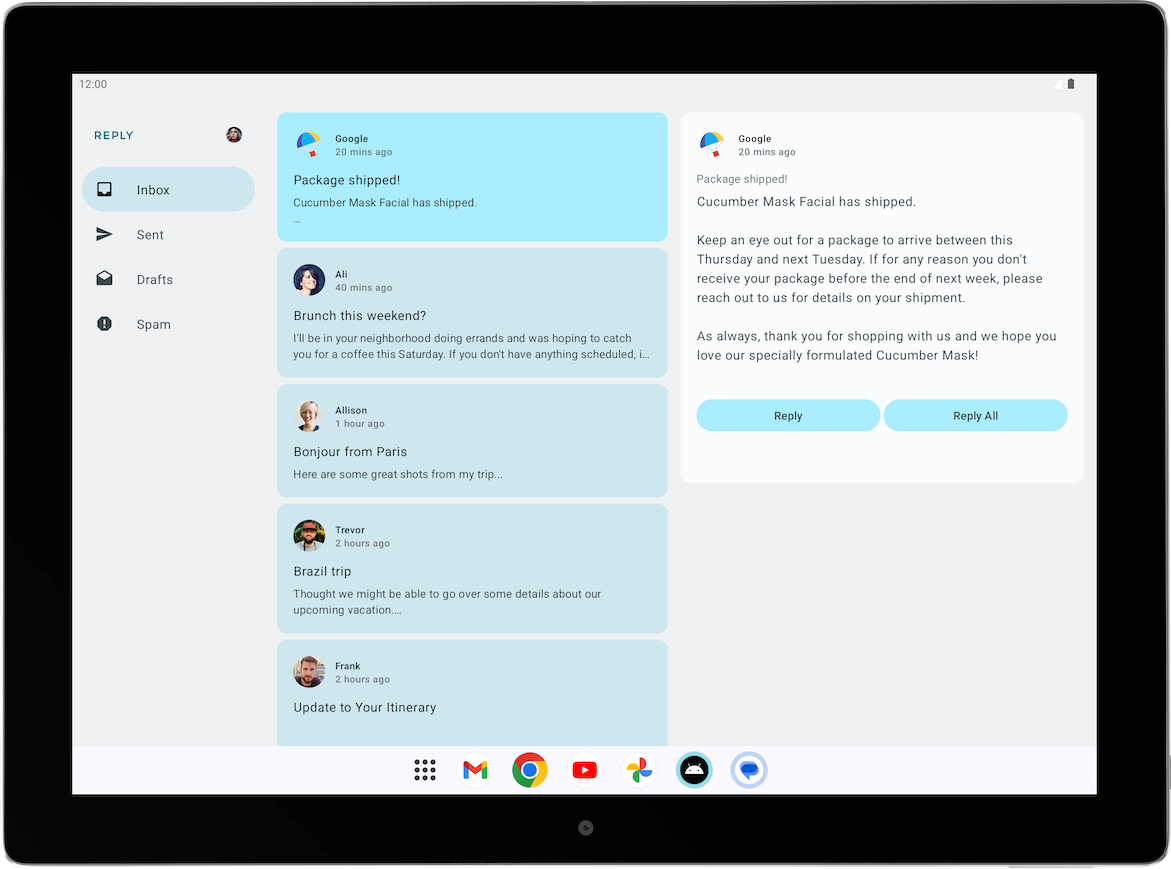前述のように、大画面になると、この重要なナビゲーション要素にアクセスするのが難しくなるため、理想的とは言えません。幸い、レスポンシブ UI のナビゲーションでは、ウィンドウ サイズクラスごとにナビゲーション要素の推奨パターンがあります。Reply アプリの場合は、以下の要素を実装できます。