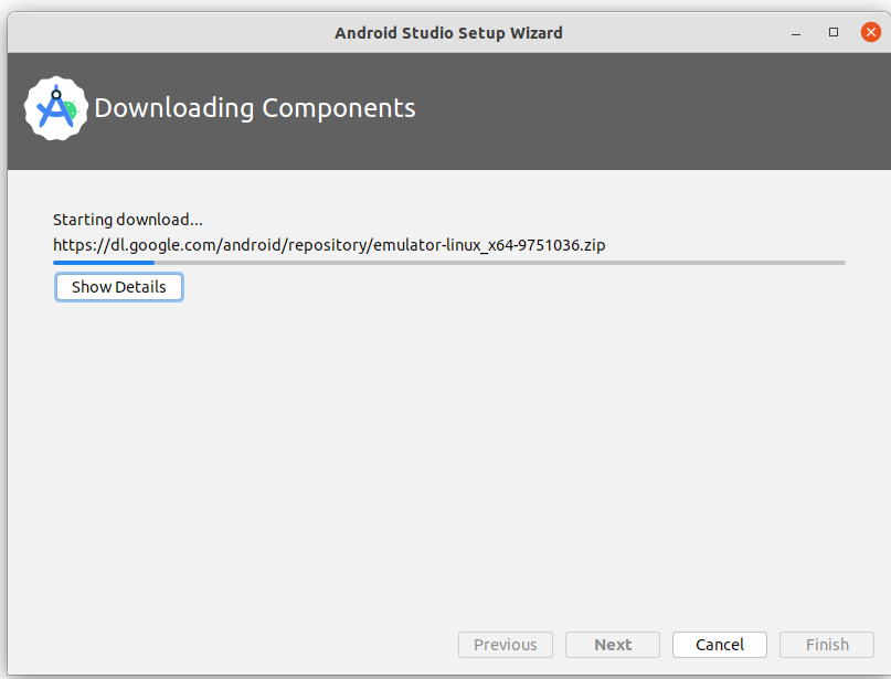 - Android 스튜디오 설정 마법사를 따라 모든 단계의 기본 설정을 수락합니다. 설치 중에 설정 마법사에서 Android 앱 개발에 필요한 추가 구성요소와 도구를 다운로드하고 설치합니다. 인터넷 속도에 따라 다소 시간이 걸릴 수 있습니다. 차를 한 잔 더 드셔도 좋아요.