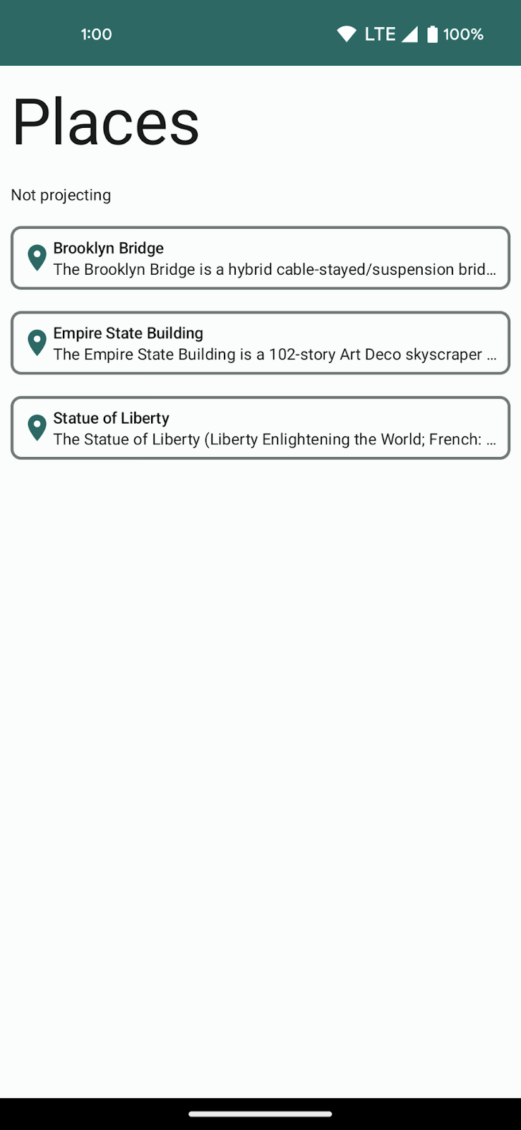 El módulo :app contiene la IU y la lógica de la app para dispositivos móviles, mientras que el módulo :common:data contiene la clase de datos del modelo Place y el repositorio que se usa para leer modelos Place. Con el objetivo de simplificar los pasos, el repositorio lee desde una lista codificada, pero podría hacerlo desde una base de datos o un servidor de backend en una app real.