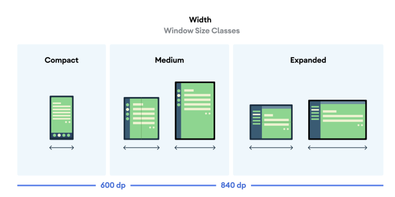 Hay tres anchos de clase de tamaño de ventana: compacto, medio y expandido. Cuando la app está en modo vertical, el ancho es el compacto y, cuando está en modo horizontal, el ancho es el expandido. A los fines de este codelab, no trabajarás con el ancho medio.