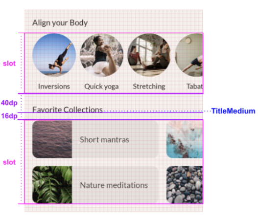 En función de esta única captura de pantalla, sería bastante difícil implementar este diseño de manera perfecta en términos de píxeles. En general, un diseñador transmite más información sobre su trabajo. Puede darte acceso a su herramienta de diseño o compartir los llamados diseños de revisión. En este caso, nuestro diseñador transfirió los diseños de revisión, que puedes usar para identificar cualquier valor de tamaño. El diseño se muestra con una superposición de cuadrícula de 8 dp de modo que puedas ver con facilidad el espacio entre los elementos y a su alrededor. Además, se agregan algunos espaciados de forma explícita para aclarar determinados tamaños.