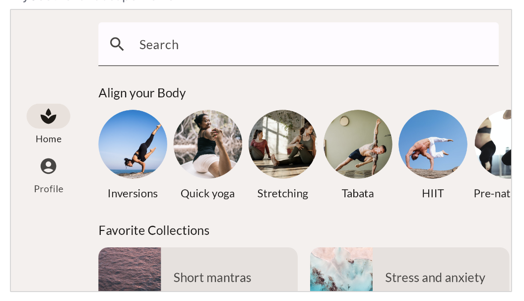 Trong lớp học lập trình này, bạn sẽ triển khai một thiết kế ứng dụng thực tế dựa trên các bản mô phỏng do nhà thiết kế cung cấp. MySoothe là một ứng dụng bảo vệ sức khỏe liệt kê nhiều cách để cải thiện cơ thể và tâm trí của bạn. Ứng dụng này có một phần liệt kê các bộ sưu tập yêu thích của bạn và một phần chứa các bài tập thể dục. Giao diện của ứng dụng:
