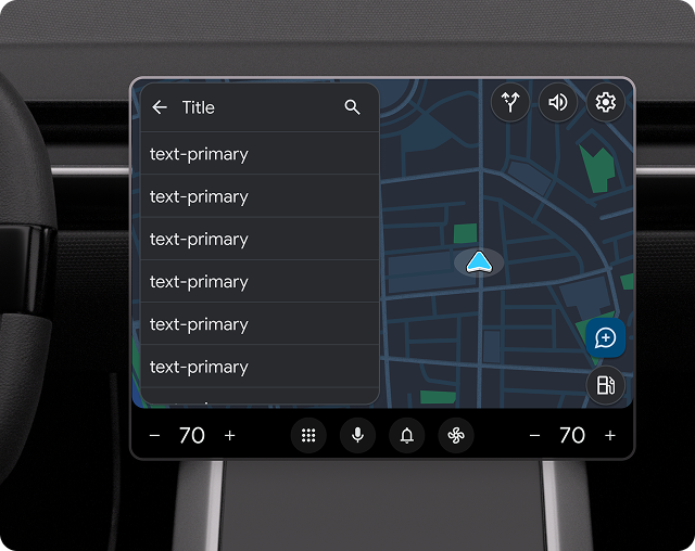 Jumlah teks sekunder yang diizinkan di setiap baris daftar bervariasi, bergantung pada apakah mobil diparkir atau sedang berjalan. Untuk meminimalkan gangguan, teks dipotong menjadi 2 baris saat mengemudi. Teks apa pun yang dimaksudkan untuk dibaca saat mengemudi harus ditampilkan di awal teks sekunder.