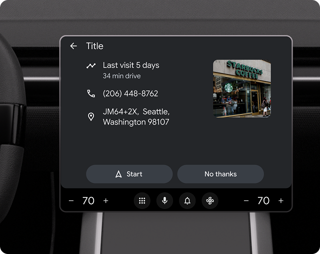 একটি পার্কিং অ্যাপের জন্য অবস্থানের বিশদ বিবরণ, দুটি সম্পর্কিত ক্রিয়া সহ (শুরু এবং না ধন্যবাদ) দুটি অ্যাকশন সহ একটি ক্যাফের জন্য অবস্থানের বিবরণ। আকারের সীমাবদ্ধতার কারণে, দ্বিতীয় অ্যাকশন বোতামের সংশ্লিষ্ট পাঠ্যটি লুকানো থাকে এবং শুধুমাত্র এর আইকনটি দেখানো হয়।