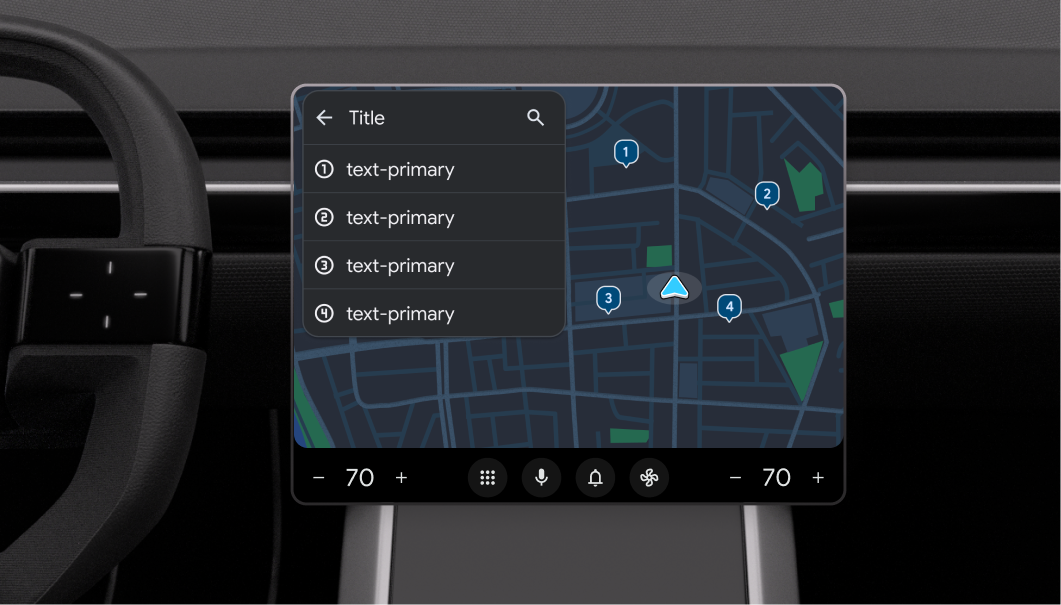 يعرض نموذج "قائمة الأماكن" قائمة مرتبة بالمواقع الجغرافية (أو الحاويات للقوائم الفرعية) معروضة على خريطة توفّرها مكتبة التطبيقات.