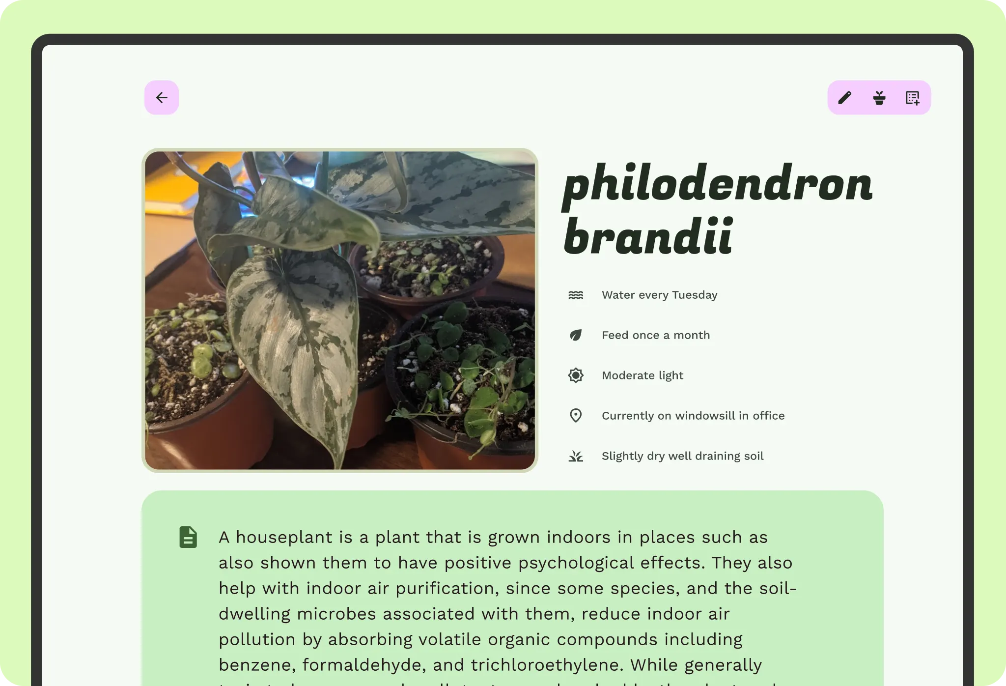 นอกจากนี้ รูปภาพยังปรับขนาดและครอบคลุมทั้งหน้าจอด้วย ซึ่งจะช่วยให้ผู้ใช้ เห็นพืชอย่างละเอียดมากขึ้น แต่ก็ไม่ได้ใช้พื้นที่อย่างมีประสิทธิภาพ โปรดคำนึงถึง สิ่งนี้เมื่อจัดโครงสร้างองค์ประกอบ UI
