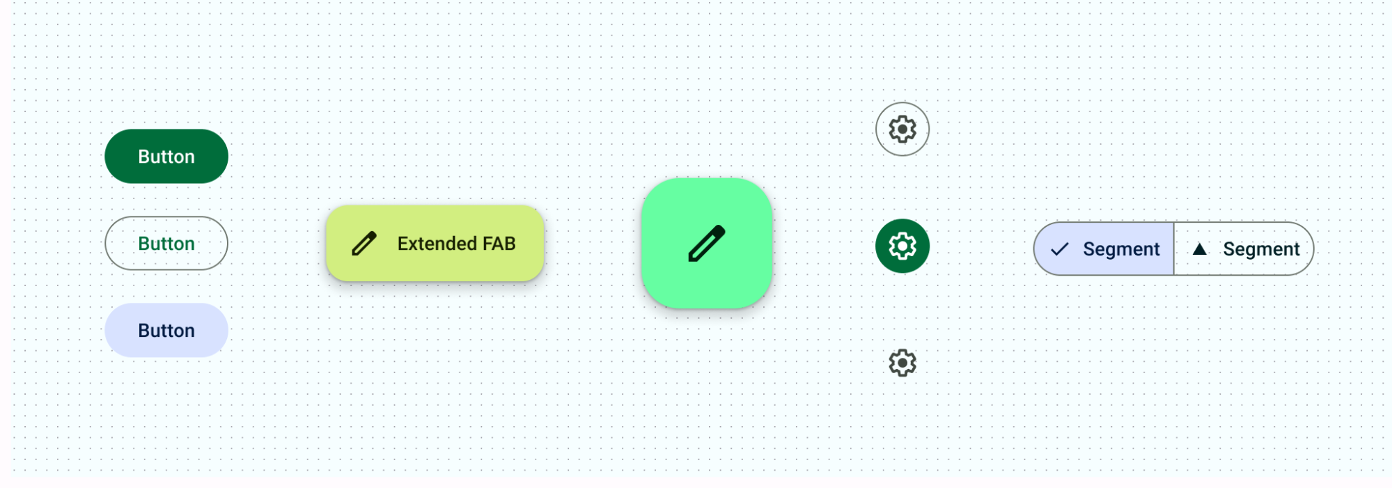 Material propose plusieurs types de boutons pour définir la priorité des actions et des interactions dans différents contextes. Des FAB ou des FAB étendus pour les actions principales aux boutons d'icône en passant par la sélection d'options avec des boutons segmentés.