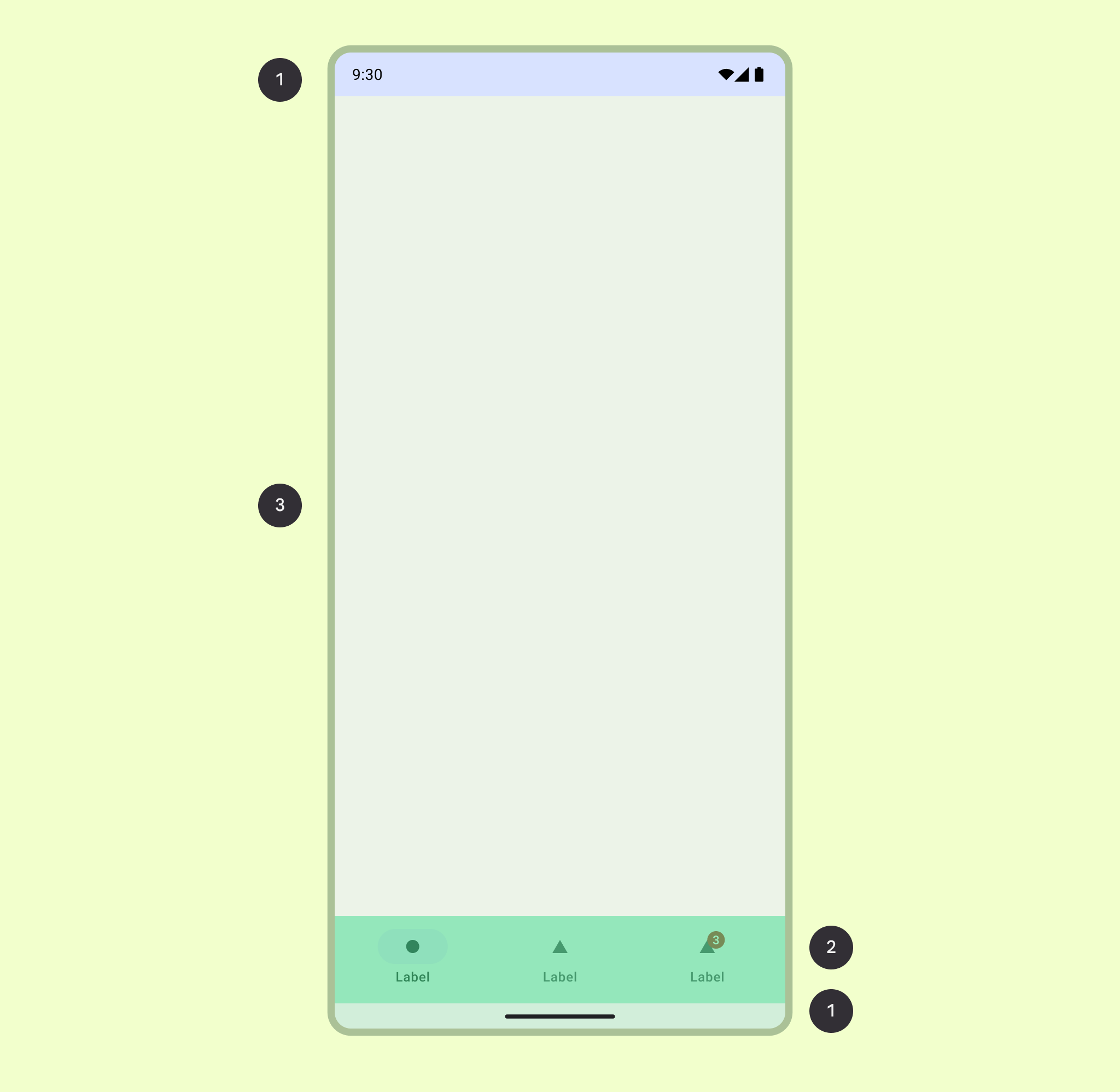 탐색 영역은 사용자가 앱에서 이동하고, 중요한 작업에 액세스하고, Android 플랫폼의 여러 곳을 이동할 수 있도록 지원하는 각종 어포던스를 나타냅니다.