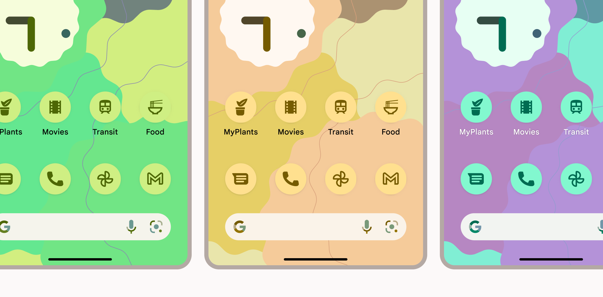 עיצובים שנוצרו על ידי משתמשים נתמכים בצבע דינמי, שזמין ב-Material You החל מ-Android 12. כשהתכונה מופעלת, המערכת יוצרת צבעים מותאמים אישית מהטפט של המשתמש ומחילה אותם על האפליקציות ועל ממשק המשתמש של המערכת. לוח הצבעים הזה משמש כנקודת ההתחלה ליצירת ערכות צבעים בהירות וכהות.