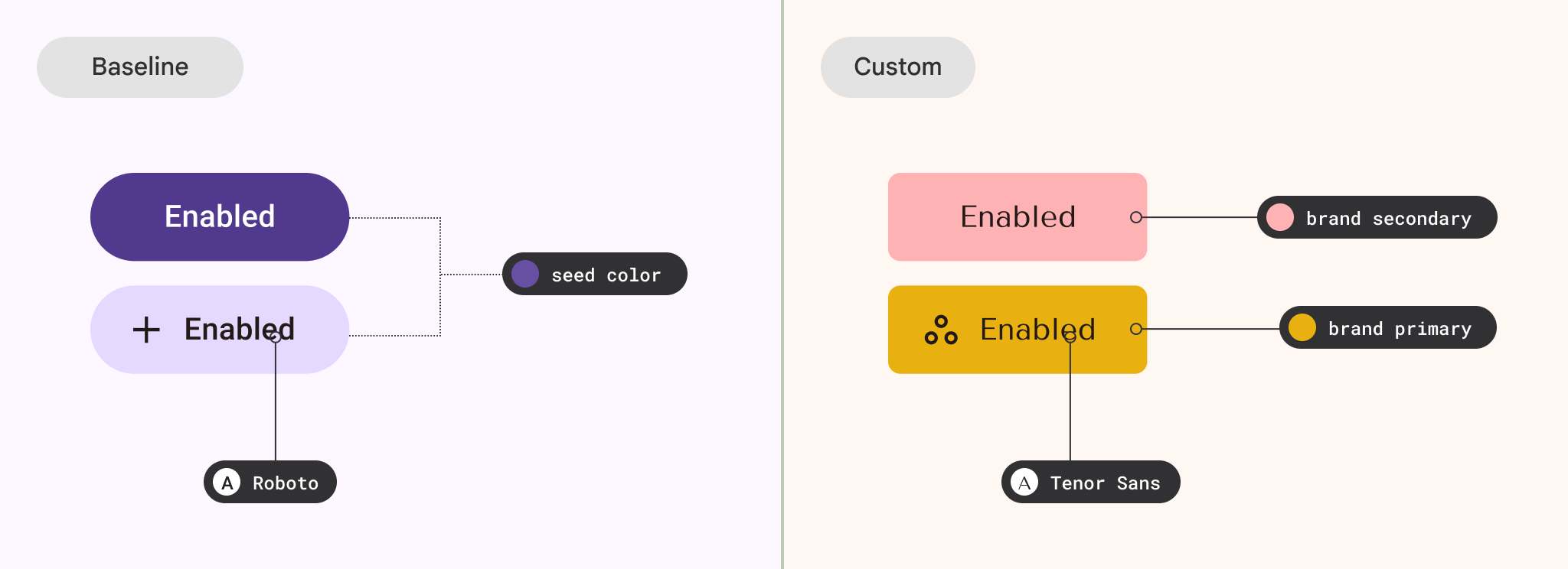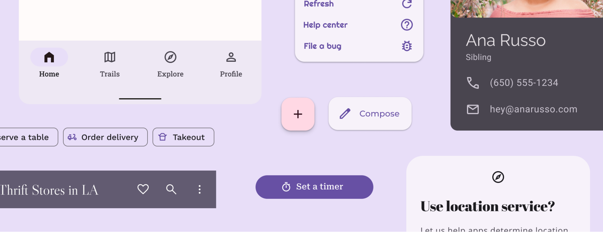 שימוש בעיצובים מותאמים אישית מאפשר לכם להביע את עצמכם בצורה רחבה יותר במראה ובתחושה של האפליקציה, או לשמש כחלופה במקרים שבהם עיצובים מסוימים של מערכת לא זמינים. האפשרות הזו שימושית גם אם אתם עובדים עם מערכת עיצוב מותאמת אישית מלאה, גם אם יש לכם מדריך מותג קטן וגם אם יש לכם כמה צבעים אהובים.