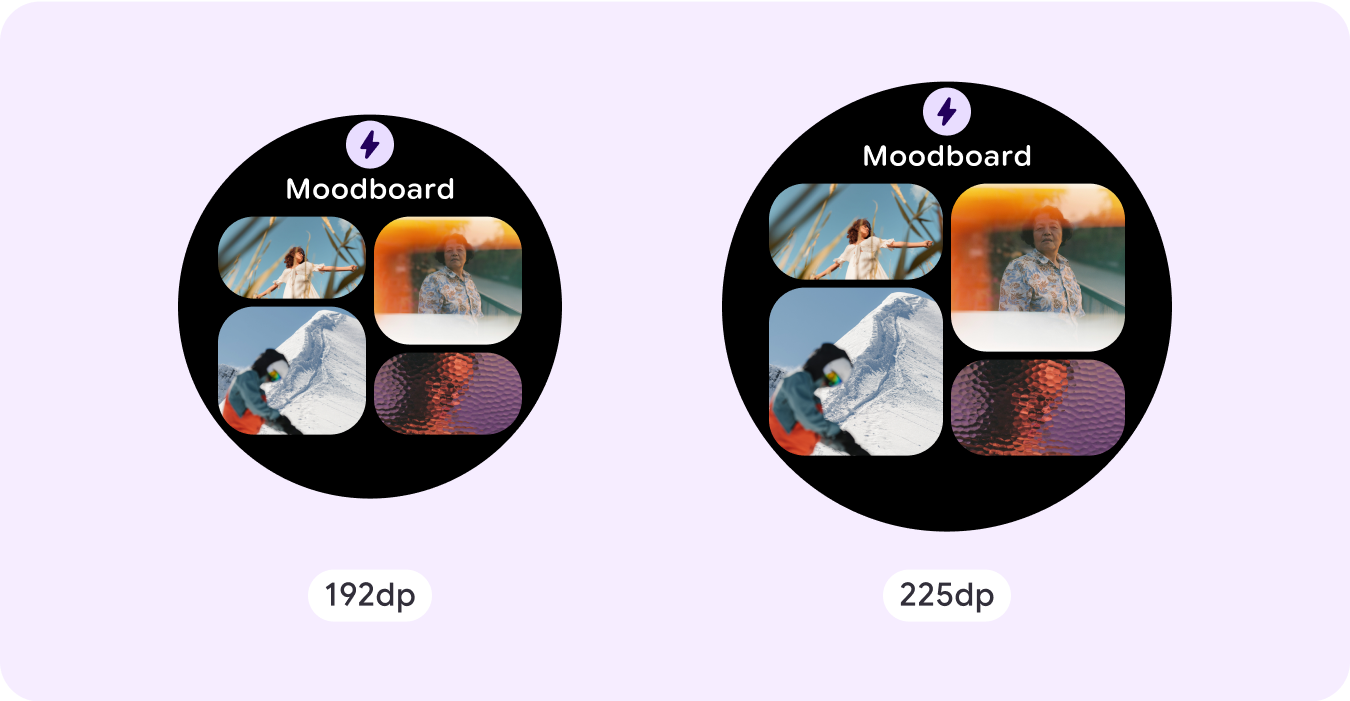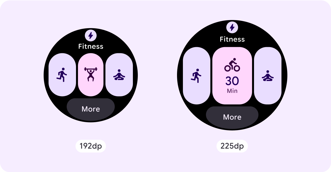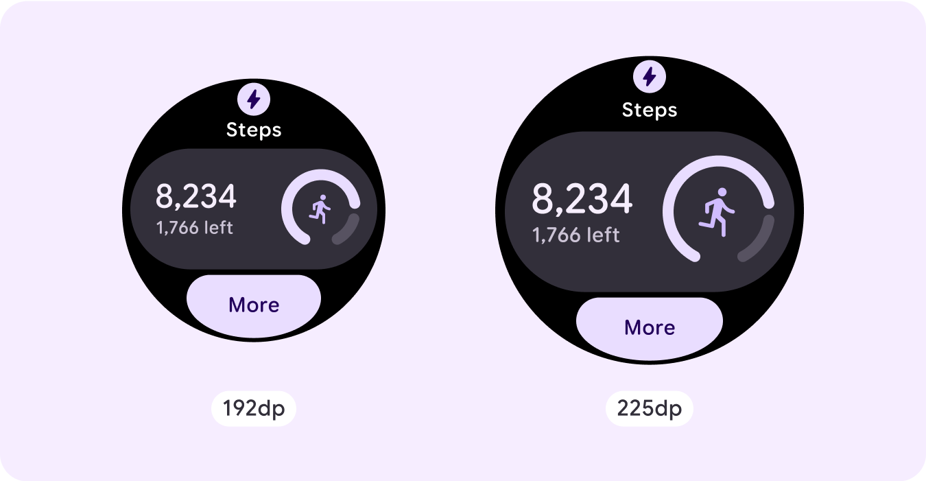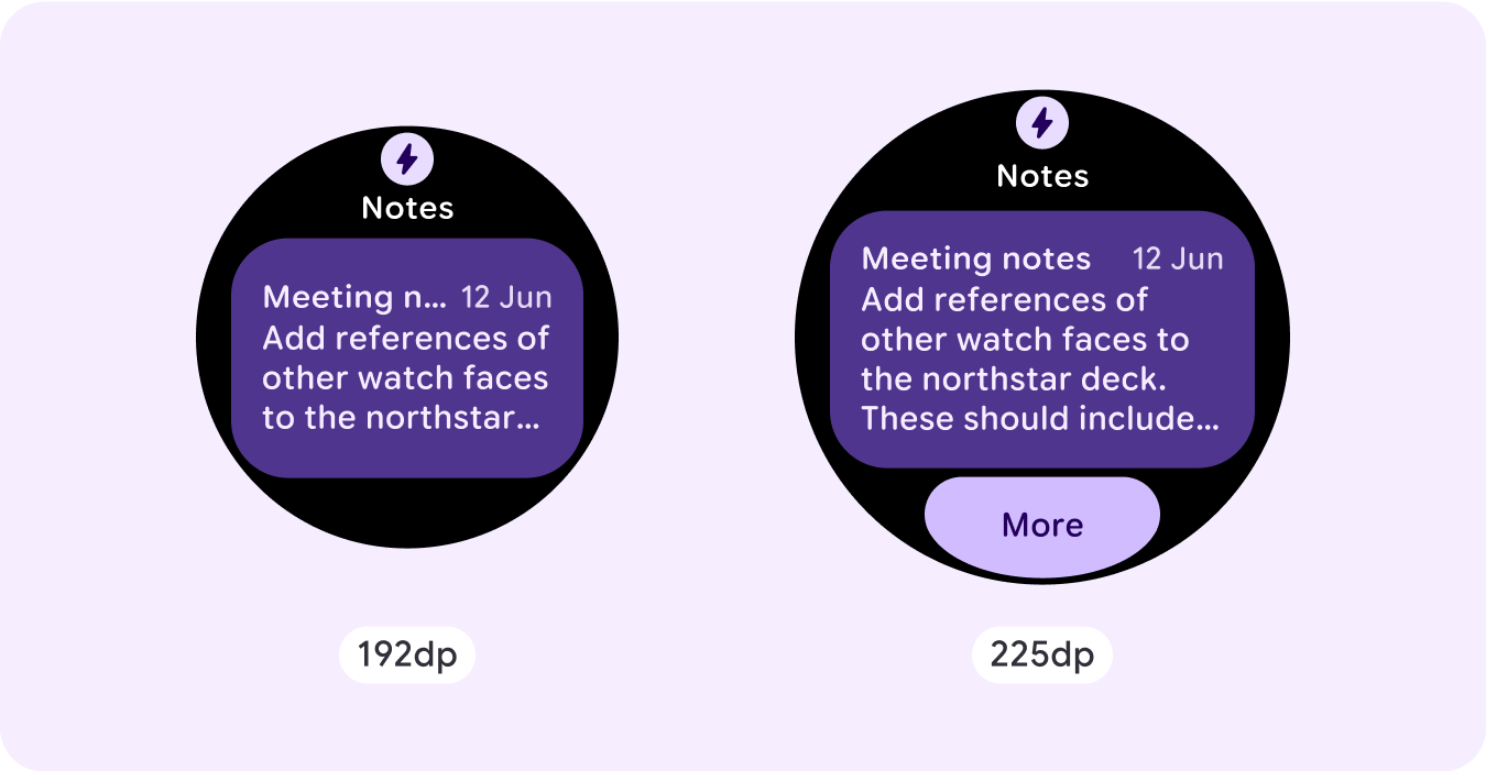 Si usas nuestras plantillas de ProtoLayout, puedes heredar estas actualizaciones automáticamente a través de la versión beta más reciente de la biblioteca de Jetpack Wear ProtoLayout. Además, solo debes proporcionar diseños en los que hayas agregado contenido o componentes adicionales después de un punto de inflexión de tamaño de pantalla. Para obtener orientación y recomendaciones completas sobre cómo aprovechar un tamaño de pantalla más grande, consulta nuestra [guía de tarjetas][2]. Las tarjetas tienen una altura de pantalla fija, por lo que ajustamos el padding para maximizar el espacio limitado de la pantalla sin crear recortes no deseados.