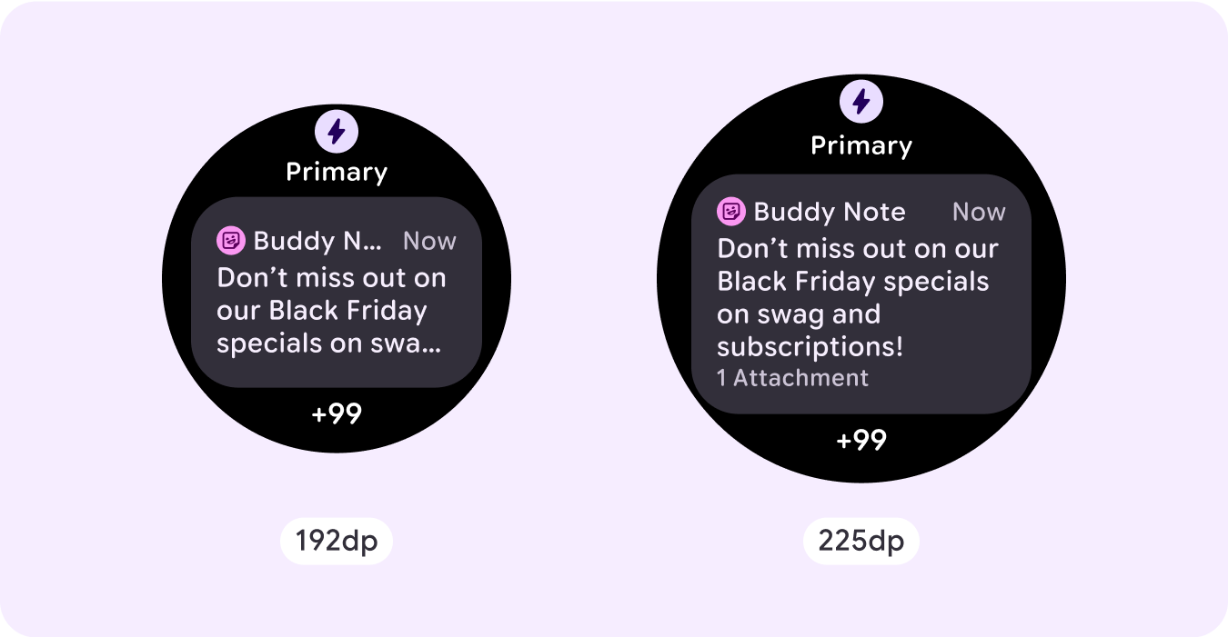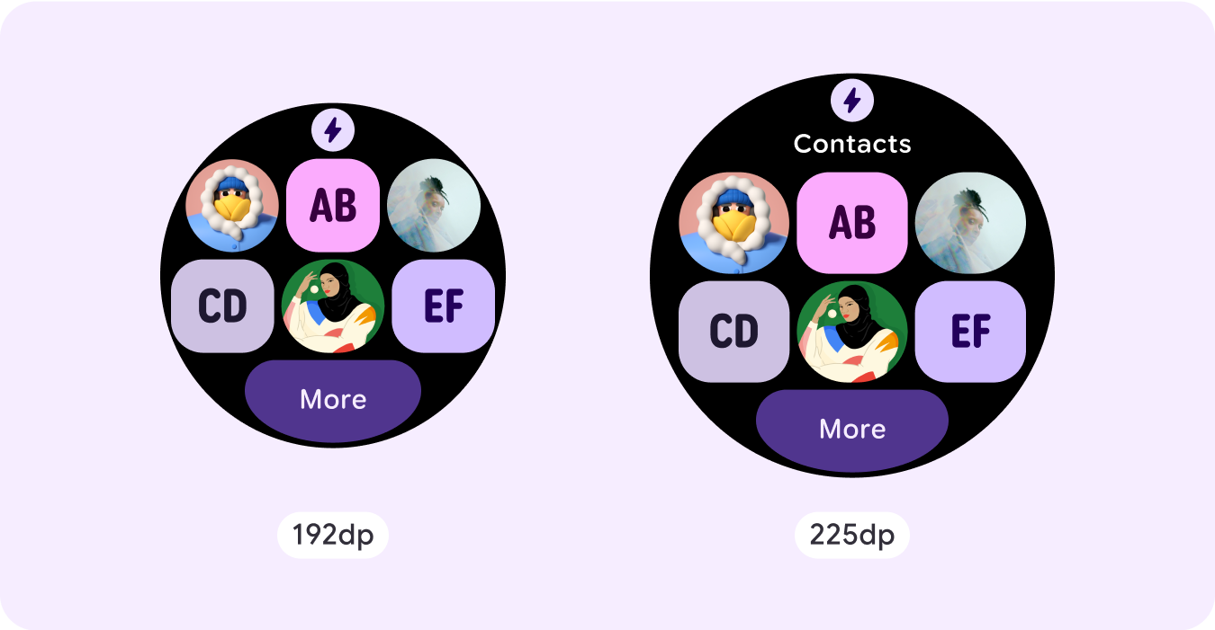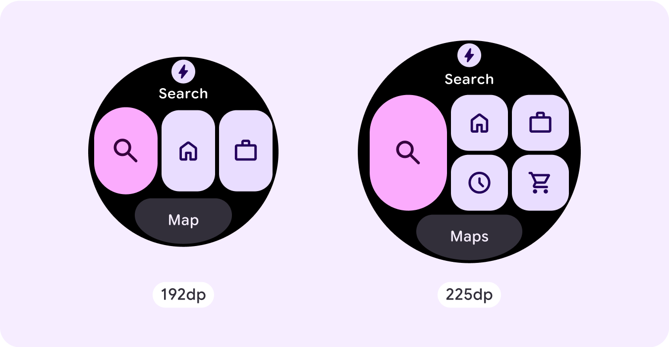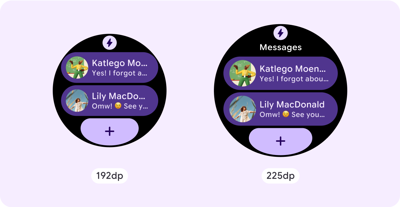Si usas nuestras plantillas de ProtoLayout, puedes heredar estas actualizaciones automáticamente a través de la versión beta más reciente de la biblioteca de Jetpack Wear ProtoLayout. Además, solo debes proporcionar diseños en los que hayas agregado contenido o componentes adicionales después de un punto de inflexión de tamaño de pantalla. Para obtener orientación y recomendaciones completas sobre cómo aprovechar un tamaño de pantalla más grande, consulta nuestra [guía de tarjetas][2]. Las tarjetas tienen una altura de pantalla fija, por lo que ajustamos el padding para maximizar el espacio limitado de la pantalla sin crear recortes no deseados.