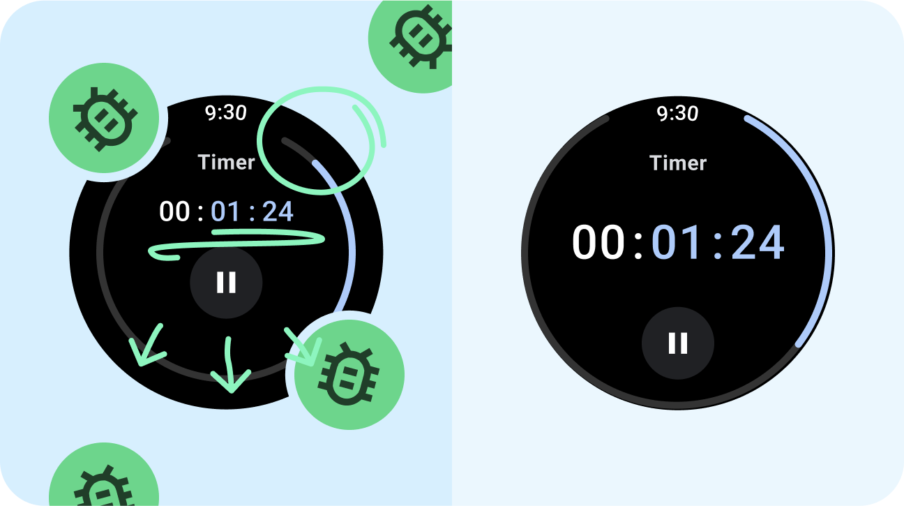 Langkah pertama dalam membuat aplikasi yang bagus untuk Wear OS adalah mempersiapkan aplikasi Anda untuk semua ukuran layar. Artinya, Anda harus menguji aplikasi di berbagai ukuran layar target serta mengidentifikasi dan memperbaiki bug yang terlihat jelas.