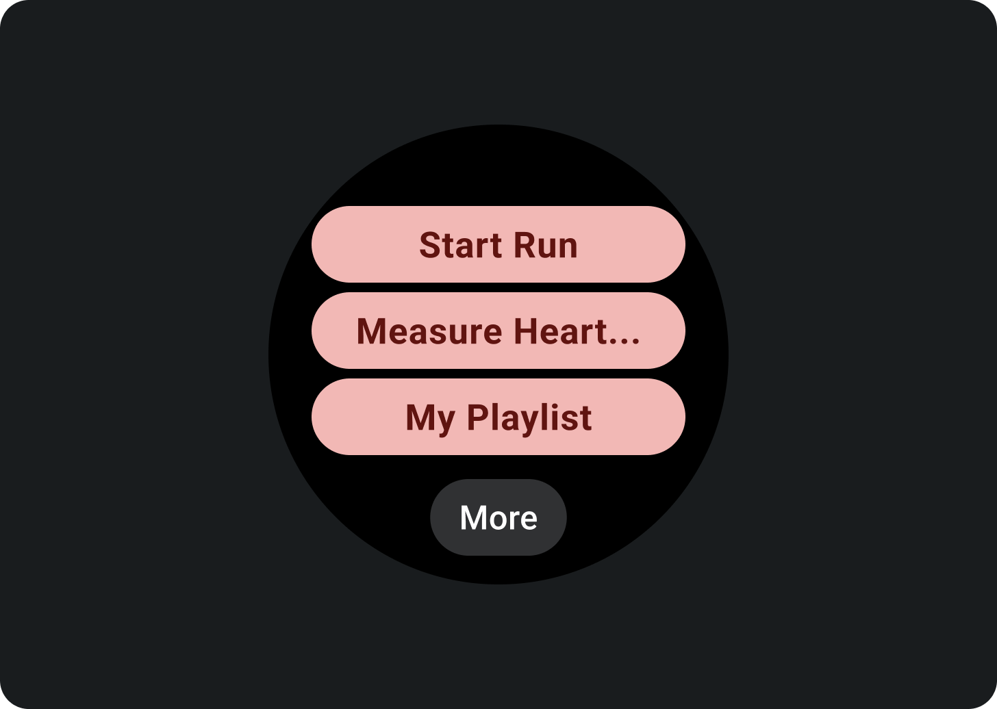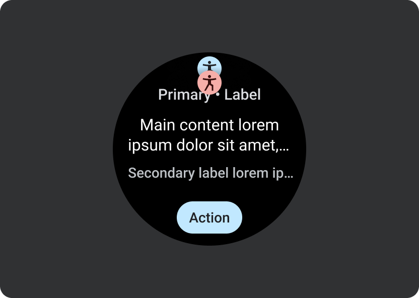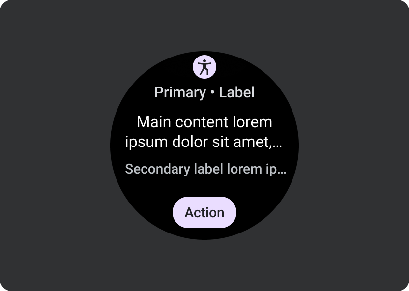 כדי להתאים למגוון גדלים של מסכים ב-Wear OS, תבניות הפריסה של ProtoLayout Material ותבניות העיצוב של Figma כוללות התנהגות רספונסיבית שמאפשרת לחריצים להתאים את עצמם באופן אוטומטי. ה-slots מיועדים למלא את רוחב הפס הזמין. חריצי התוכן הראשי והתווית המשנית תואמים לגודל התוכן, אבל המארז שמכיל אותם ממלא את הגובה הזמין. השוליים מוגדרים כאחוזים, עם שוליים פנימיים נוספים שנוספים לחריצים בחלק התחתון ובחלק העליון של המסך, כדי להתחשב בתנודות בעקומה של המסך כשהוא מתרחב.