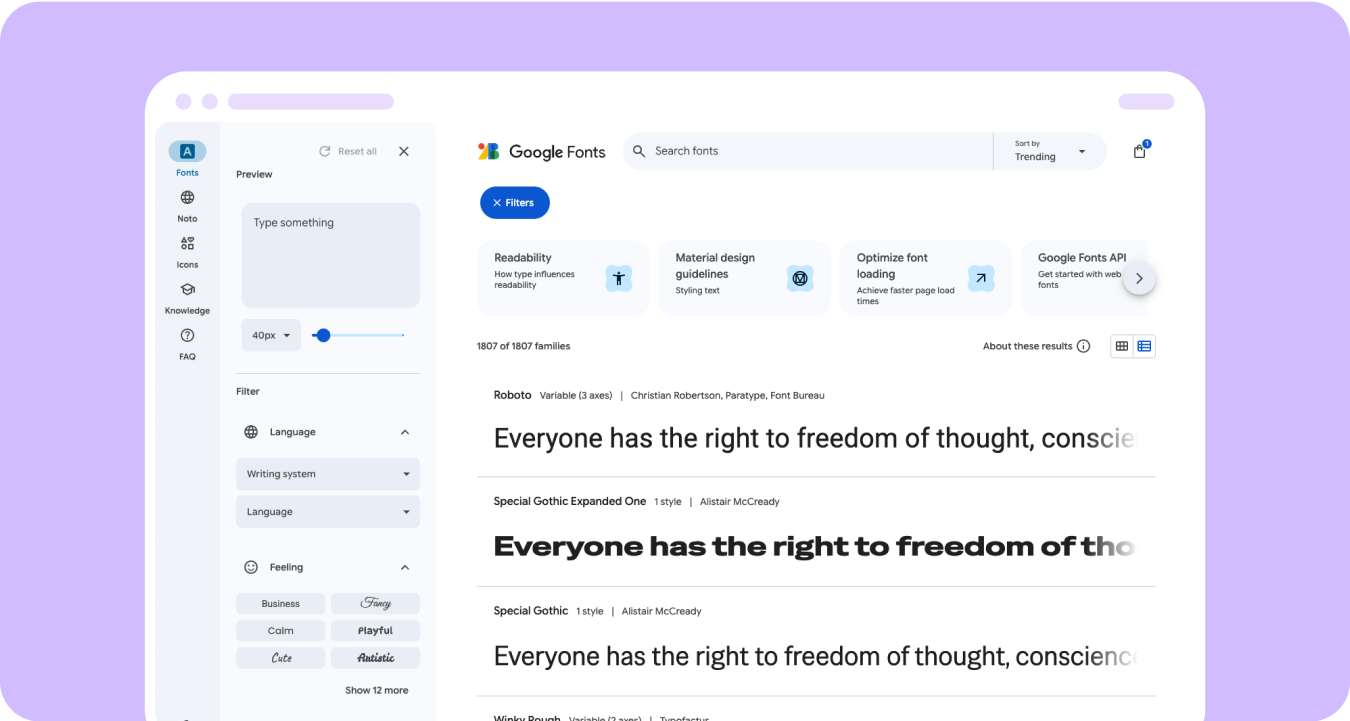 Busca entre una gran variedad de fuentes. Una vez que busques y selecciones la fuente que desees, aparecerán opciones en el panel derecho para cambiar el tamaño, cambiar el color y copiar la fuente personalizada en el portapapeles.