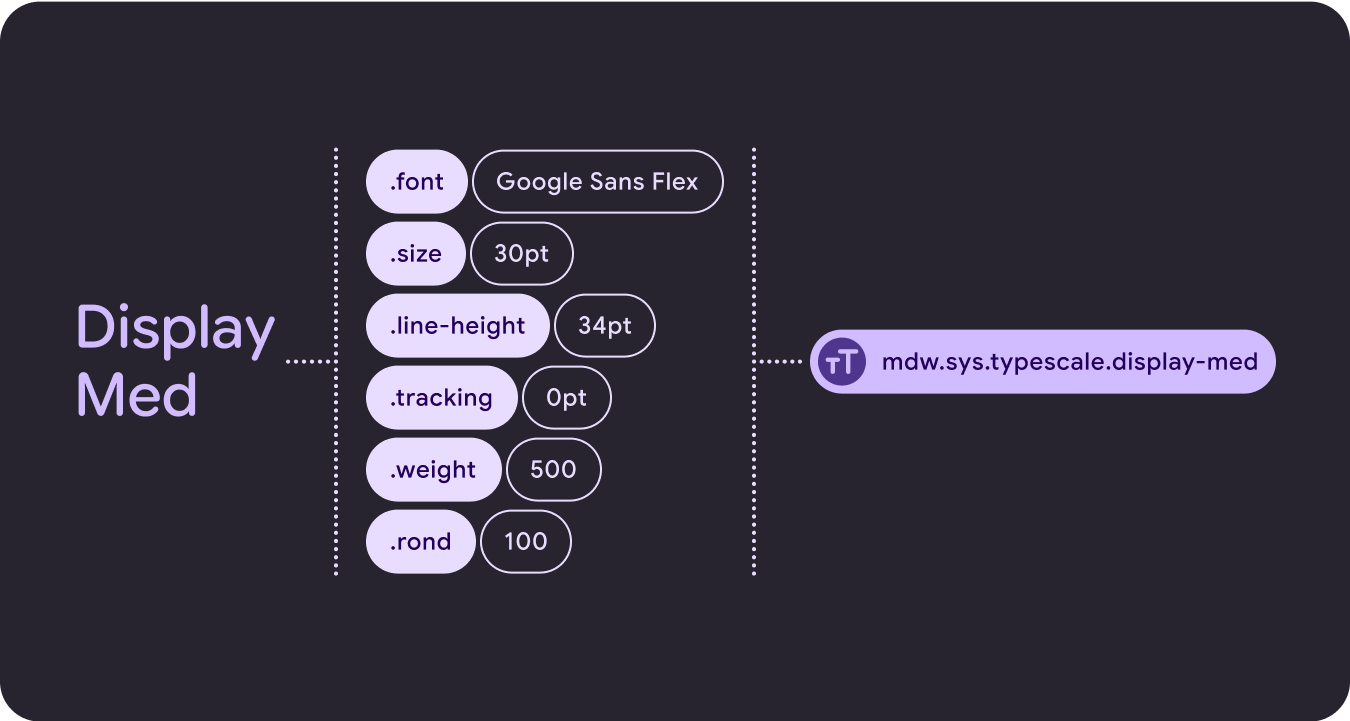 La tipografía ayuda a que el texto en la pantalla o en la IU sea legible y precioso. Los tipos de letra incluyen: pantalla, título, etiqueta, cuerpo, arco y números. Usa tokens para definir la fuente, la altura de línea, el tamaño, el seguimiento, el ancho y el grosor.