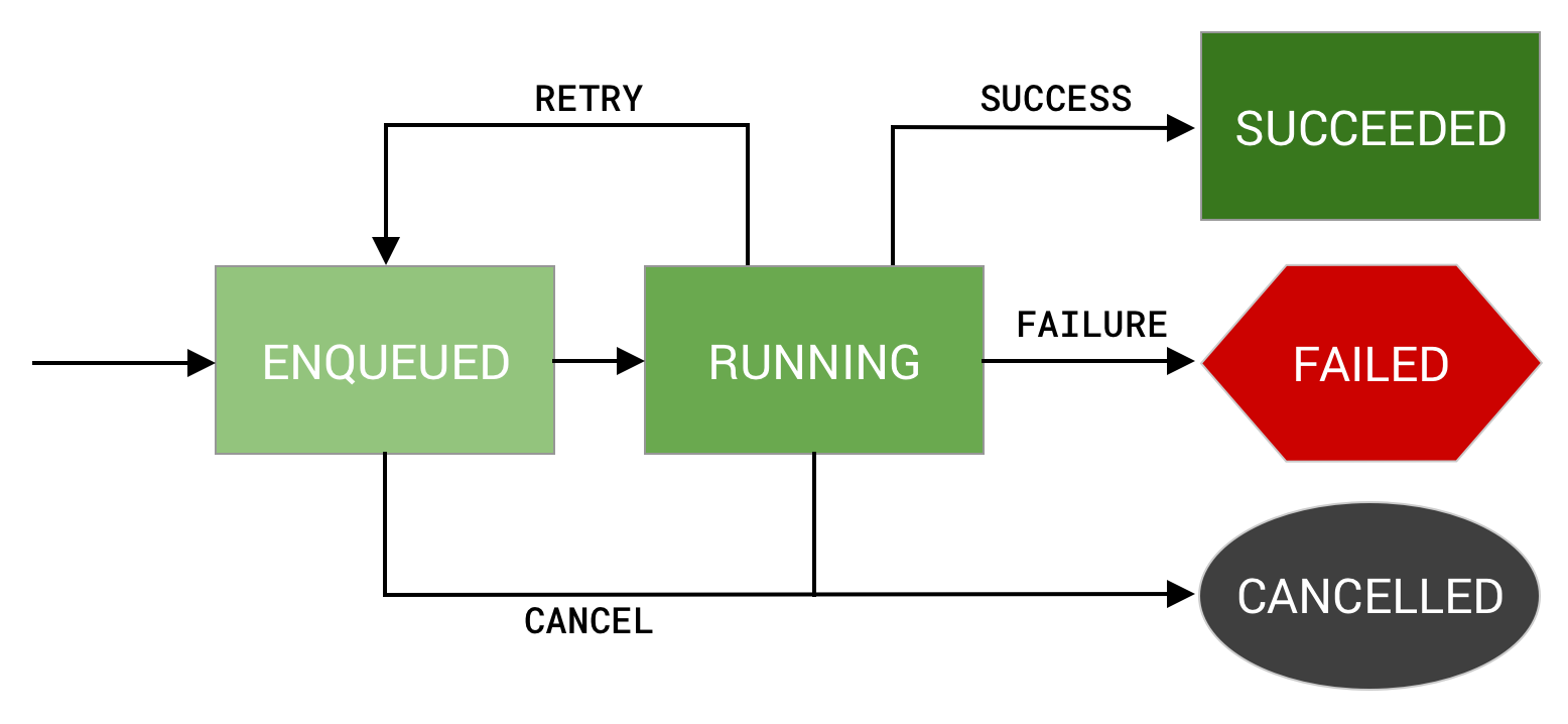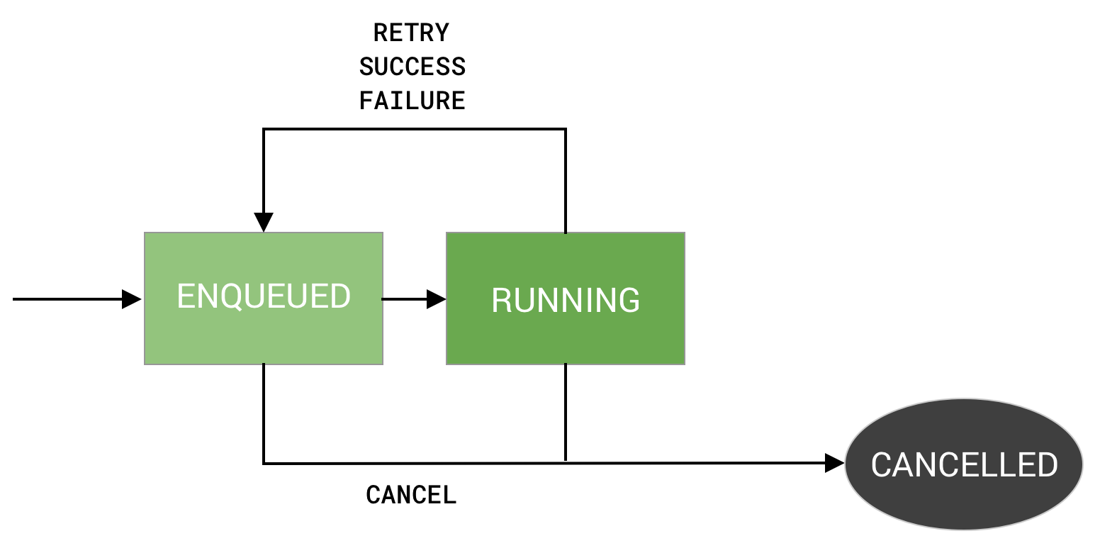 Pada status ENQUEUED, pekerjaan Anda memenuhi syarat untuk dijalankan segera setelah Constraints dan persyaratan waktu penundaan awal terpenuhi. Dari sana, status beralih ke RUNNING, lalu bergantung pada hasilnya, pekerjaan dapat beralih ke SUCCEEDED, FAILED, atau mungkin kembali ke ENQUEUED jika hasilnya retry. Pada tahap mana pun dalam proses ini, pekerjaan dapat dibatalkan. Pada titik ini, pekerjaan akan beralih ke status CANCELLED.