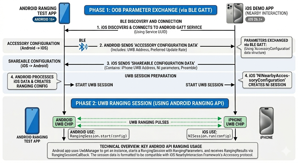 בסוג הסשן הזה (RANGING_SESSION_RAW), האפליקציה עוקפת את תהליך ה-OOB של מודול ה-Ranging ומטפלת בעצמה במשא ומתן ובפרמטרים של ה-OOB. כלומר, האפליקציה צריכה לקבוע אילו טכנולוגיות נתמכות במכשיר העמית, לנהל משא ומתן על פרמטרים של טווח ולהתחיל את סשן מדידת הטווח.