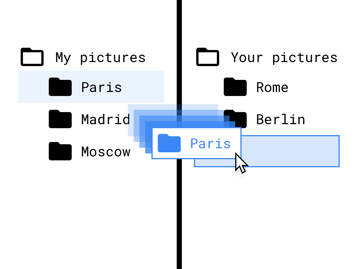Tworzenie interakcji przeciągania, takich jak ta na poniższym rysunku, może zapewnić wydajne i intuicyjne funkcje zwiększające produktywność w aplikacji. Więcej informacji znajdziesz w sekcji Przeciąganie.