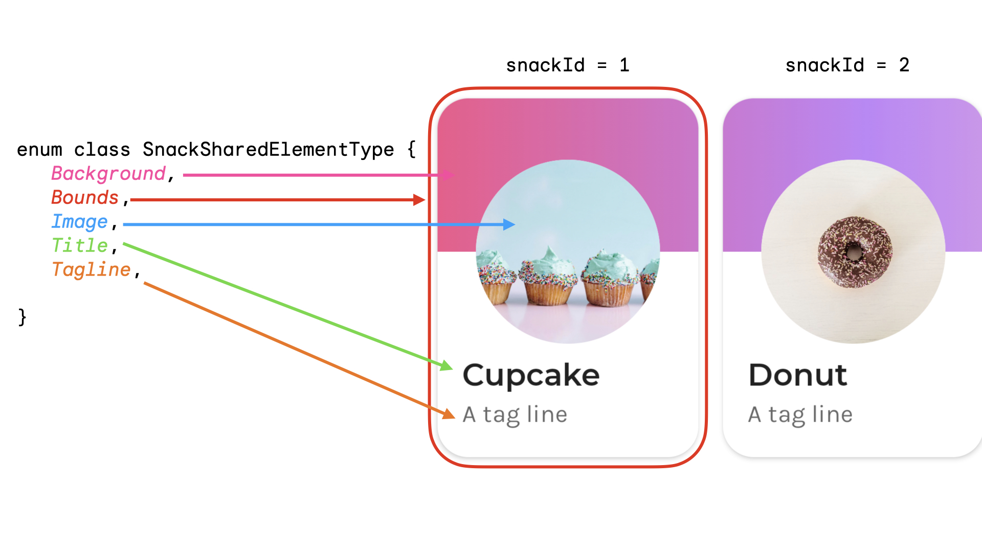 شما می‌توانید یک enum برای نمایش نوع عنصر مشترک ایجاد کنید. در این مثال، کل کارت میان وعده می‌تواند از چندین جای مختلف در صفحه اصلی، مثلاً در بخش "محبوب" و "توصیه شده" نیز ظاهر شود. می‌توانید یک کلید ایجاد کنید که شامل snackId ، origin ("محبوب" / "توصیه شده") و type عنصر مشترکی باشد که به اشتراک گذاشته خواهد شد: