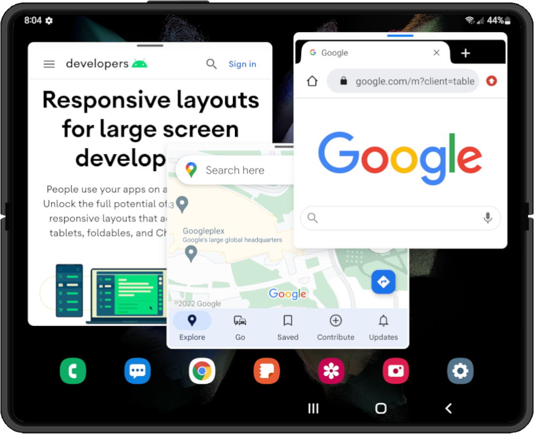 Los dispositivos plegables con pantalla grande tienen una pantalla del tamaño de una tablet que es ideal para realizar varias tareas a la vez en el modo multiventana. Los dispositivos plegables admiten el modo de pantalla dividida. Algunos incluso admiten el modo de ventanas de escritorio, en el que las apps se encuentran en ventanas que se pueden mover y cambiar de tamaño, de forma similar a un sistema de ventanas de escritorio.
