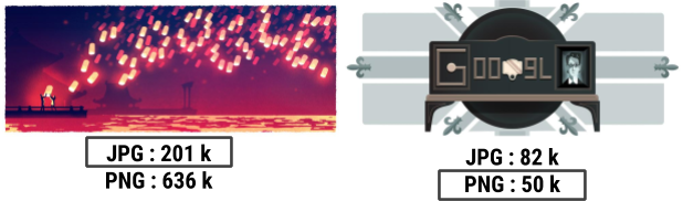 Keputusan antara PNG dan JPG sering kali bergantung pada kerumitan gambar itu sendiri. Gambar 5 menunjukkan dua gambar yang cukup berbeda, bergantung pada skema kompresi mana yang diterapkan developer. Gambar di sebelah kiri memiliki banyak detail kecil, dan akibatnya terkompresi lebih efisien dengan JPG. Gambar di sebelah kanan, dengan warna yang sama, terkompresi lebih efisien dengan PNG.