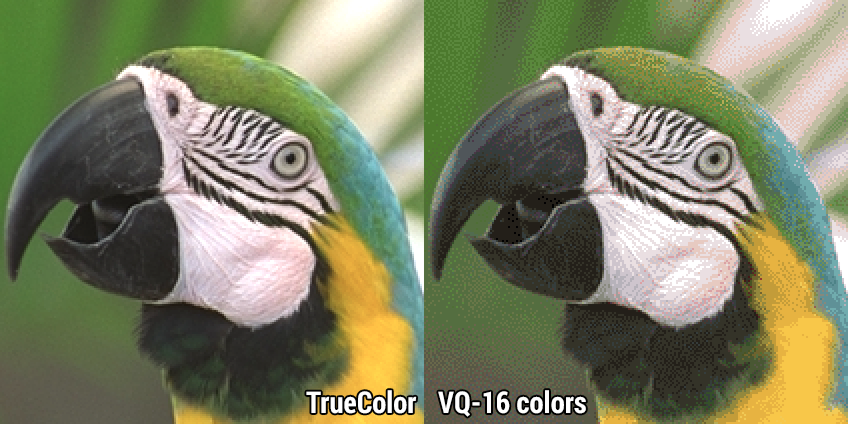 Teknik ini juga memungkinkan Anda menentukan jumlah maksimum warna unik dalam gambar. Misalnya, Gambar 4 menunjukkan kepala burung beo dalam 16,7 juta warna (24 bit per piksel, atau bpp) bersama versi yang hanya mengizinkan penggunaan 16 warna unik (3 bpp).