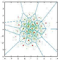 Proses pembuatan gambar terindeks dapat dijelaskan dengan lebih baik melalui kuantisasi vektor (VQ). VQ berfungsi sebagai proses pembulatan angka multidimensi. Dalam proses ini, semua warna dalam gambar dikelompokkan berdasarkan kesamaannya. Untuk kelompok tertentu, semua warna dalam kelompok tersebut diganti dengan satu nilai titik tengah, yang meminimalkan error warna di sel tersebut (atau "site", jika Anda menggunakan terminologi Voronoi). Dalam Gambar 3, titik hijau merepresentasikan warna input, dan titik merah adalah titik tengah yang mengganti warna input. Setiap sel dibatasi oleh garis biru.