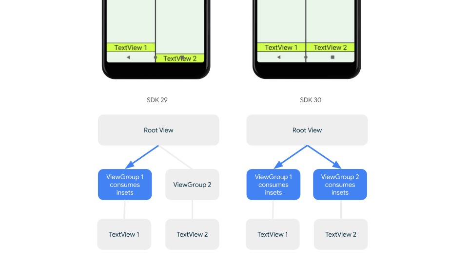 برای تأیید اینکه insetها برای همه نسخههای اندروید پشتیبانیشده به siblingها ارسال میشوند، قبل از مصرف insetها ViewGroupCompat#installCompatInsetsDispatch استفاده کنید، که در AndroidX Core و Core-ktx 1.16.0-alpha01 و بالاتر موجود است.
