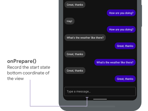 Se llama a onPrepare cuando comienza una animación de inserciones y antes de que se vuelvan a diseñar las vistas debido a una animación. Puedes usarlo para guardar el estado inicial, que, en este caso, es la coordenada inferior de la vista.