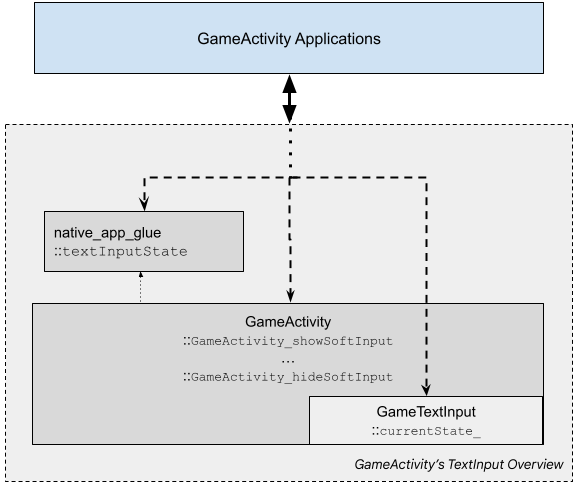 Los eventos de teclado en pantalla se pasan de GameTextInput en el lado de Java al lado de C/C++ a través de la JNI, luego viajan hasta el wrapper de GameActivity y, por último, se reflejan en la marca android_app::textInputState implementada en native_app_glue. Las aplicaciones deben sondear esta marca de forma periódica para realizar el procesamiento previsto: