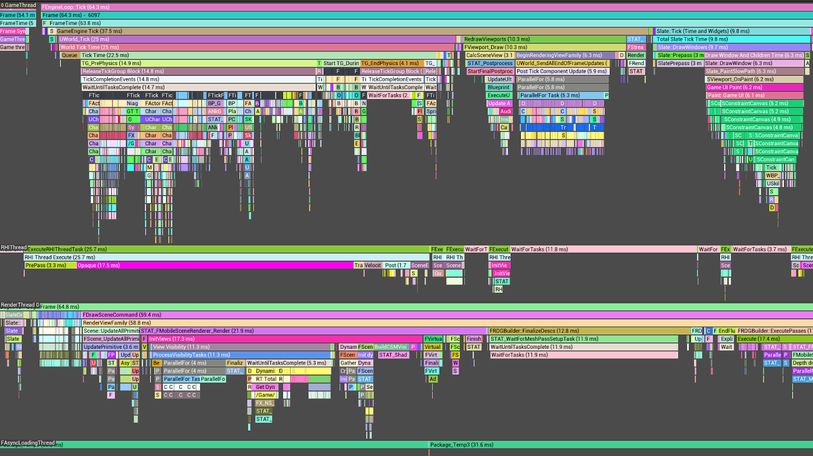 Within Unreal Engine projects, the Unreal Insight Tool facilitates the analysis of timing trace information for individual threads comprising a frame.
