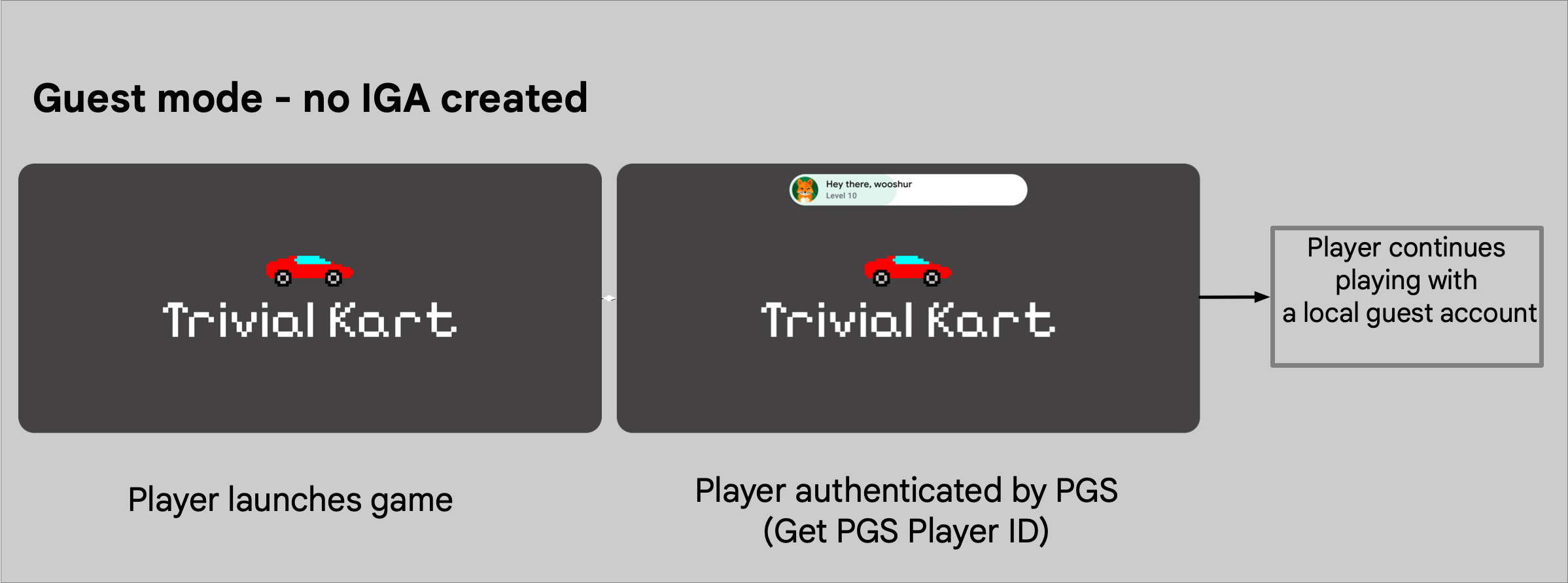 Spieler können das Spiel starten und mit einem lokalen Gastkonto spielen. PGS authentifiziert weiterhin im Hintergrund. Wenn der Spieler Fortschritt speichern auswählt, wird die Gast-Sitzung in ein permanentes IGA umgewandelt und an die PGS-Spieler-ID gebunden.