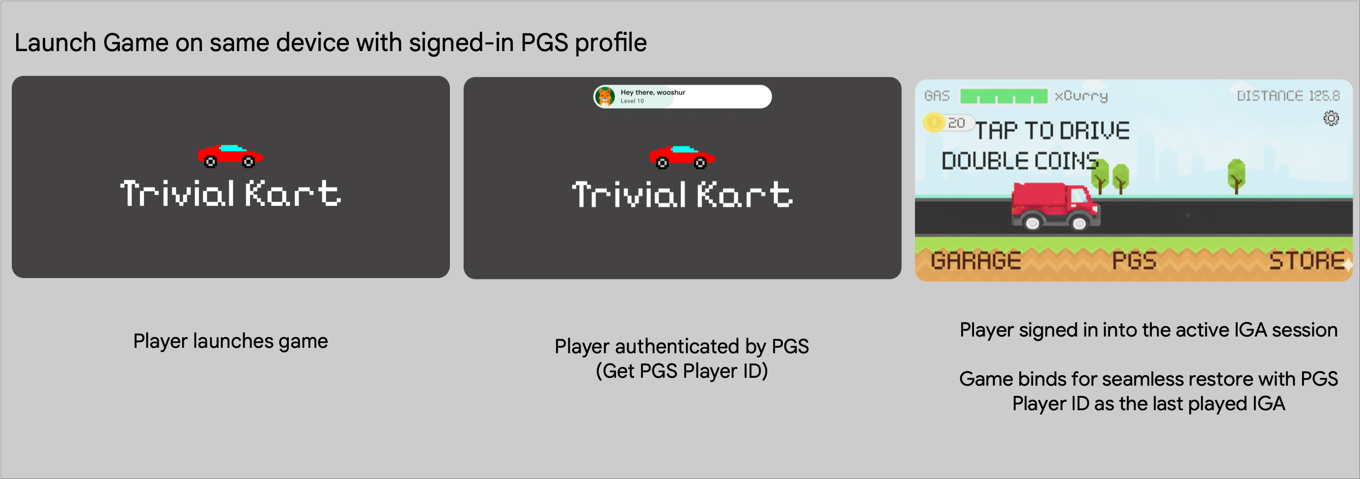- המשחק גם מקשר את מזהה ה-IGA שנבחר למזהה השחקן ב-PGS, ומסמן אותו כמזהה ה-IGA האחרון שהופעל לצורך שחזור חלק.