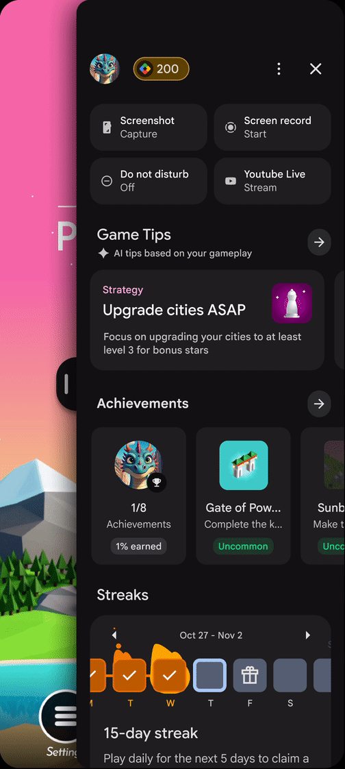 ستختلف الميزات المتوفّرة في Sidekick حسب اللعبة، وذلك استنادًا إلى حالة دمج "خدمات ألعاب Google Play" وحالة الاشتراك في برنامج Play Points. يمكنك توقُّع الميزات التالية: