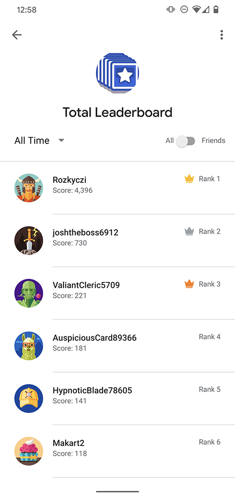 Ten en cuenta que, aunque no se muestra ningún resultado, debemos usar startActivityForResult para que la API pueda obtener la identidad del paquete que realiza la llamada. A continuación, se muestra un ejemplo de la IU predeterminada de tablas de clasificación.