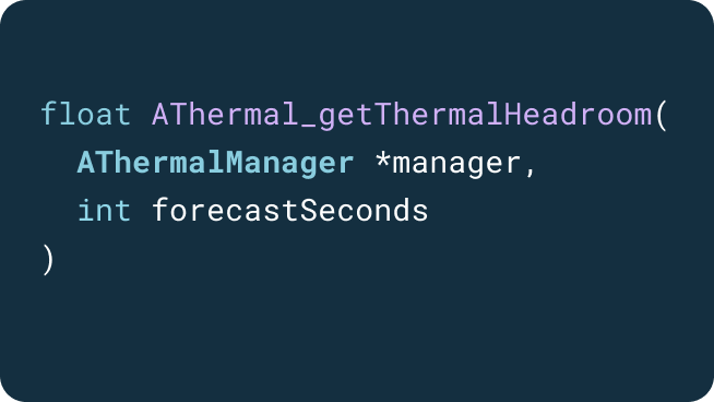 راجِع نموذج تطبيق يعرض الحالة الحرارية للجهاز باستخدام واجهة برمجة التطبيقات getThermalHeadroom API وواجهة برمجة التطبيقات لمراقبة الحالة الحرارية. يغيّر التطبيق أيضًا حجم العمل بشكل ديناميكي استنادًا إلى تلميح واجهة برمجة التطبيقات، ويستخدم واجهة برمجة تطبيقات PerformanceHintManager API للتحكّم في أداء سلسلة عمليات العرض.