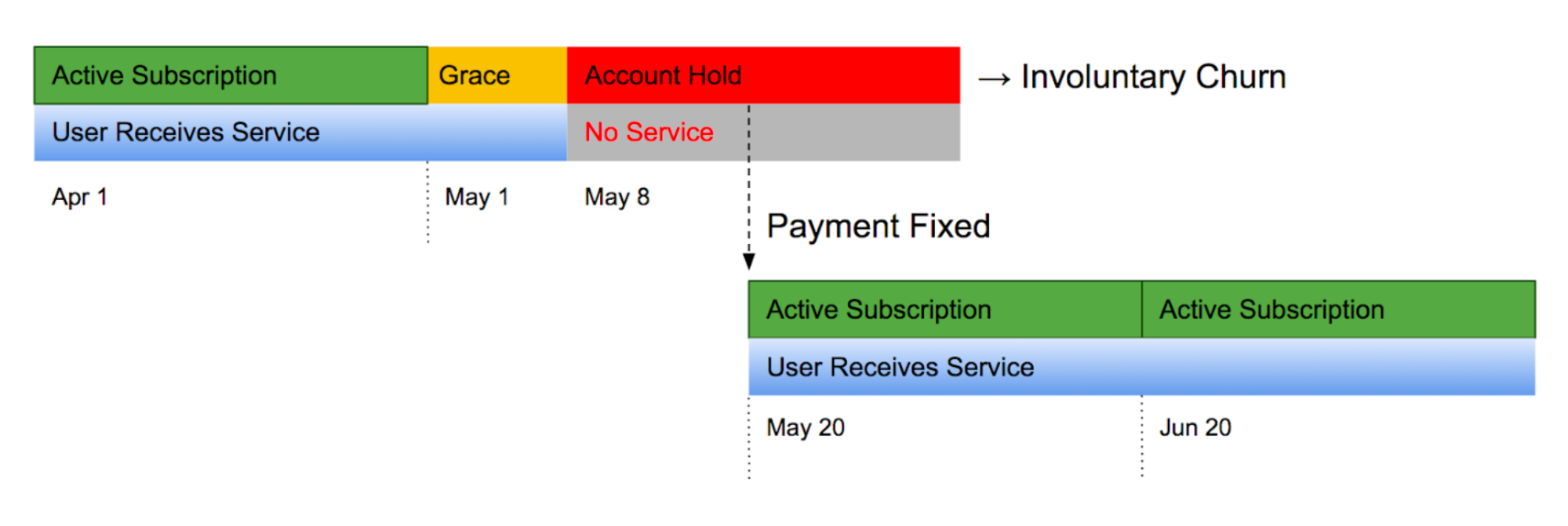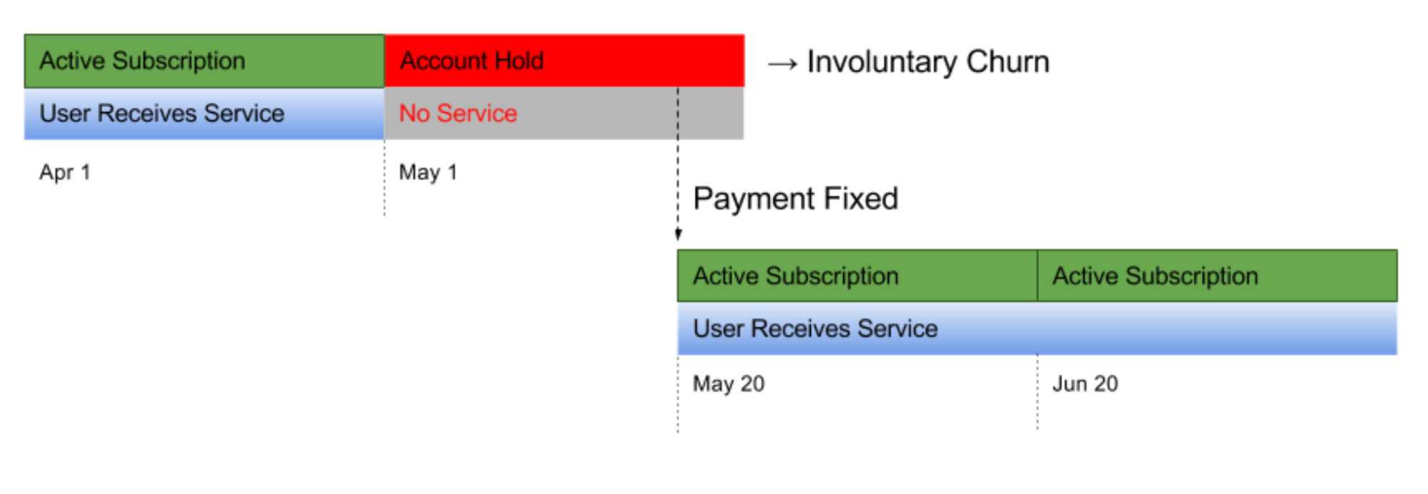 شکل ۲ جدول زمانی اشتراکی را نشان میدهد که وارد دوره تنفس میشود و سپس با اصلاح روش پرداخت توسط کاربر، به حالت عادی برمیگردد. پس از پایان دوره تنفس، کاربر باید مزایای اشتراک را از دست بدهد و به حالت تعلیق در حساب کاربری برود.