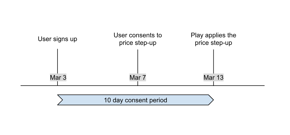 في 3 مارس، اشترك مستخدم في اشتراك في كوريا الجنوبية مع فترة تجريبية مجانية لمدة 10 أيام. يوافق المستخدم على زيادة السعر أثناء الاشتراك. في هذا السيناريو، يطبّق Play زيادة السعر في 13 مارس.