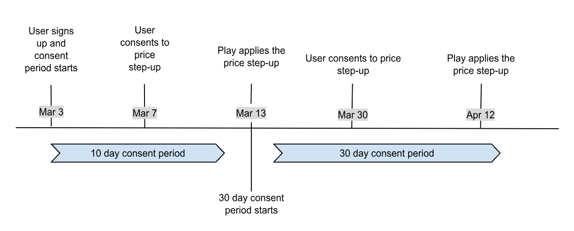 Em 3 de março, um usuário assina um plano na Coreia do Sul com um período de teste sem custo financeiro de 10 dias. O usuário consente com o aumento gradual de preço durante a inscrição. Nesse cenário, o Google Play aplica o aumento de preço em 13 de março.