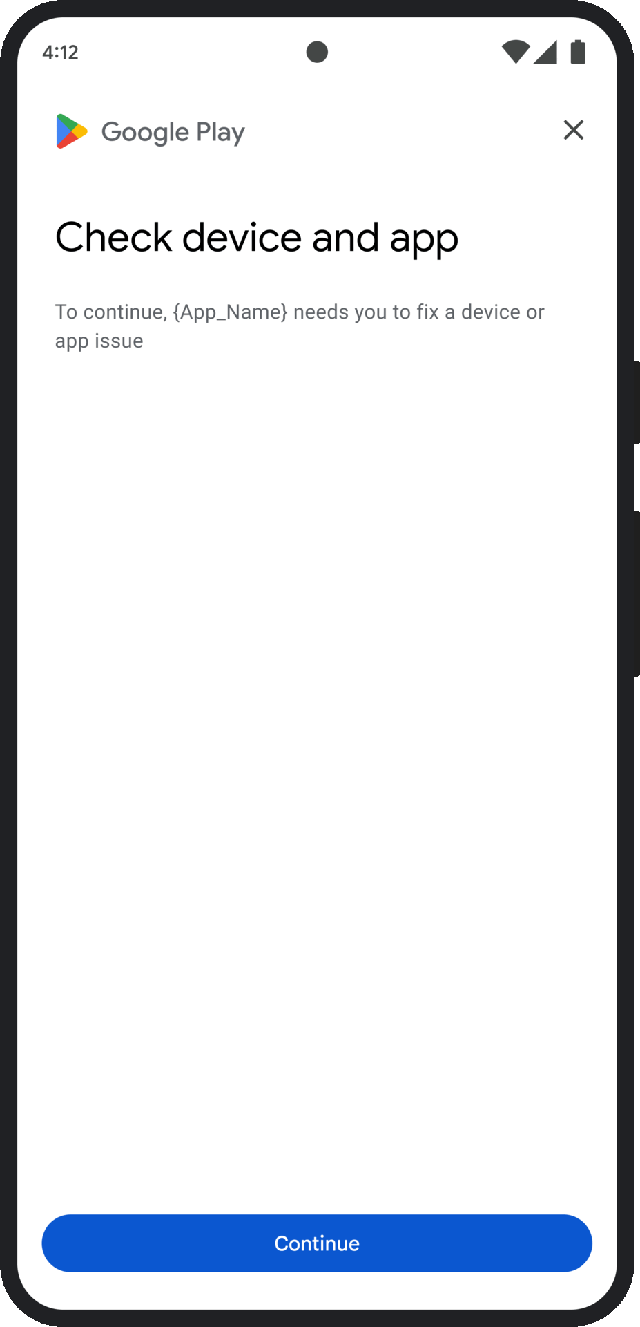 - ক্লায়েন্ট-সাইড ব্যতিক্রম : ডায়ালগটি ইন্টিগ্রিটি API ব্যতিক্রমের কারণ হিসেবে চিহ্নিত যেকোনো অন্তর্নিহিত সমস্যা পরীক্ষা করে সমাধানের চেষ্টা করে। উদাহরণস্বরূপ, এটি ব্যবহারকারীকে Google Play পরিষেবার একটি পুরানো সংস্করণ আপডেট করার জন্য অনুরোধ করতে পারে।