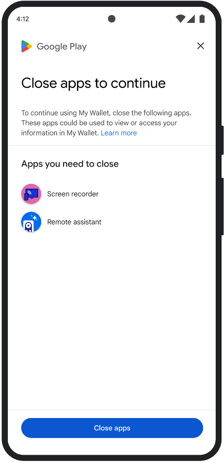 Integridade do app: se forem detectados problemas como acesso não autorizado ou adulteração do app, a caixa de diálogo vai pedir que o usuário adquira o app na Play Store para corrigir o problema.