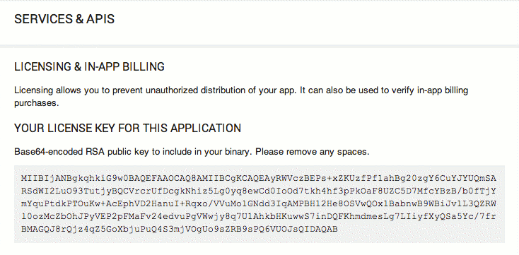- Obtener la clave pública de la aplicación para la licencia. Cuando implementas una licencia en una aplicación, debes copiar la cadena de clave pública en la aplicación. Puedes obtener la clave pública de la app para la licencia en la página Servicios y API (en Todas las aplicaciones).
