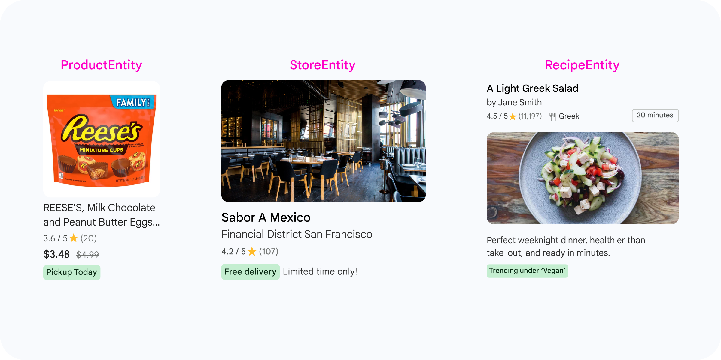 الشكل :`ProductEntity` و`StoreEntity` و `RecipeEntity`. (*واجهة المستخدِم لأغراض توضيحية فقط) - يمكن أن تتألف مجموعة الاقتراحات من