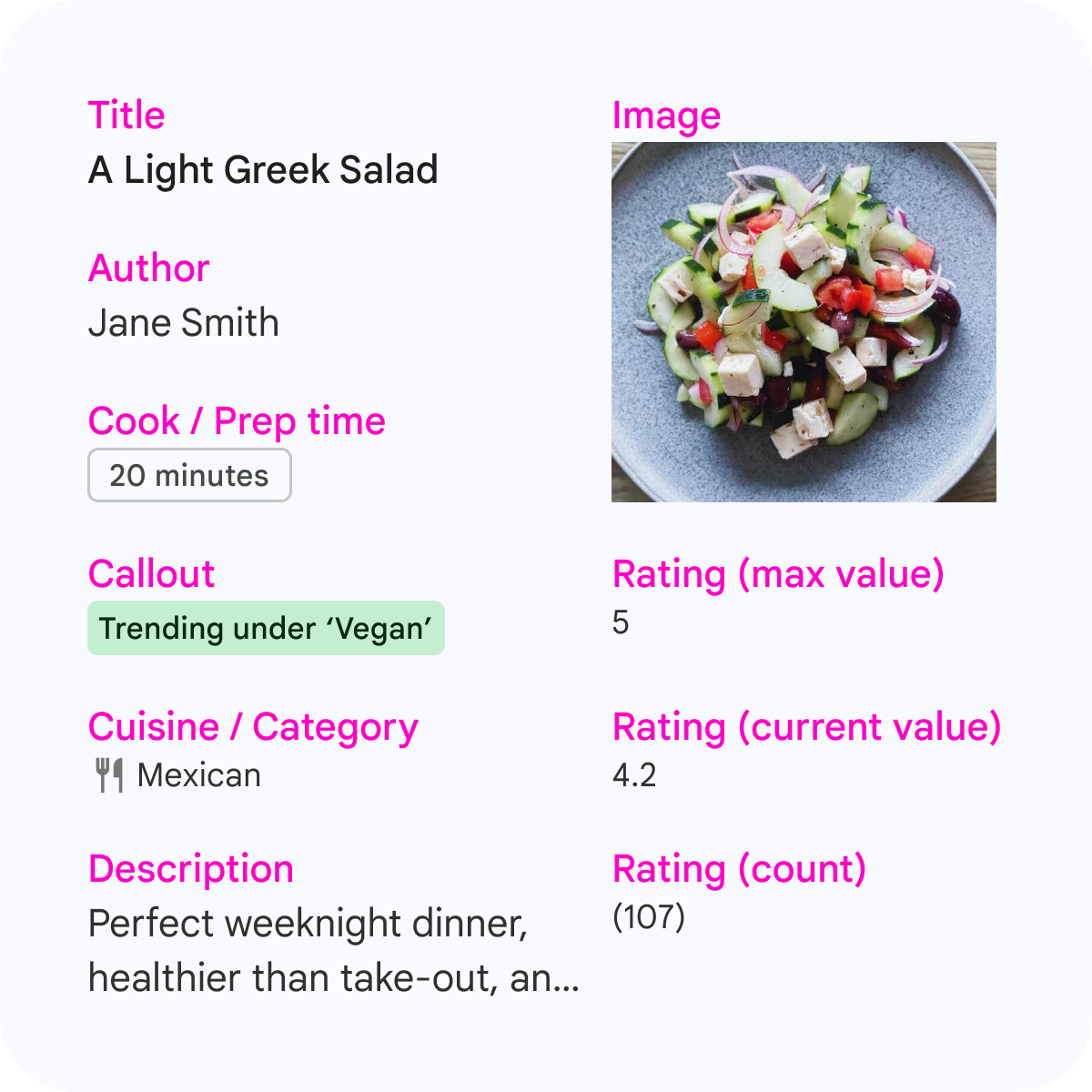 | Action Uri | مطلوبة | تمثّل هذه السمة الرابط لصفحة في التطبيق تعرض تفاصيل حول وصفة الطعام. ملاحظة: يمكنك استخدام الروابط لصفحات في التطبيق لتحديد مصدر الإحالة. يُرجى الرجوع إلى الأسئلة الشائعة |