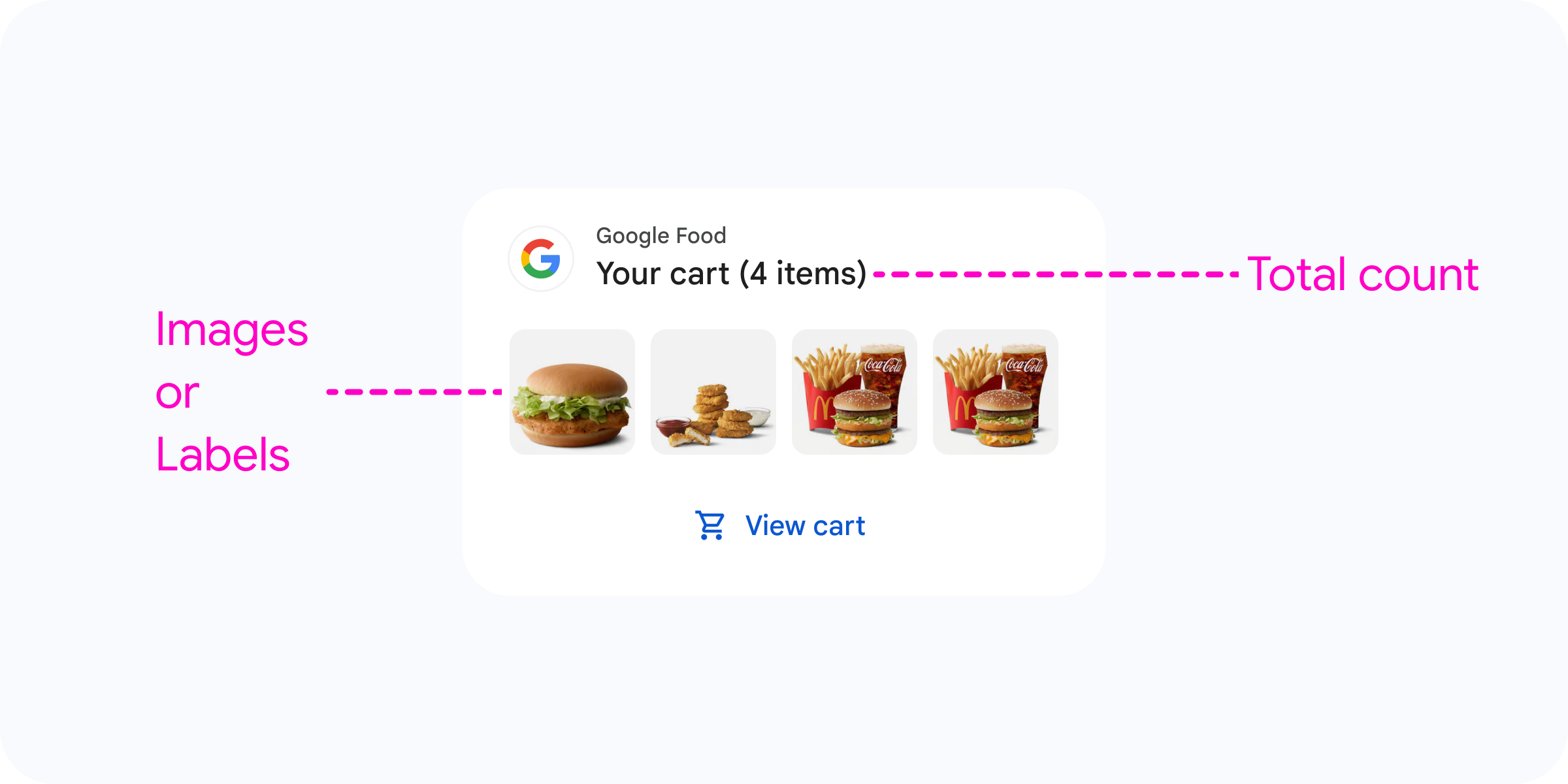 يجب أن تعرض مجموعة "سلة تسوّق الطعام" العدد الإجمالي للعناصر في السلة، ويمكن أن تتضمّن أيضًا صورًا لعدد X من العناصر في سلة المستخدم.