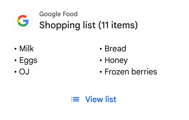 com.google.android.engage.action.food.PUBLISH_FOOD_SHOPPING_LISTتوصیه میشود هنگام دریافت این intent، فراخوانیpublishFoodShoppingListsآغاز شود. -